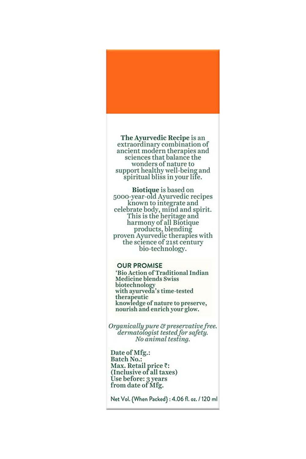 Brand Information: A combination of the 5,000-year-old science of Ayurveda and 21st-century biotechnology. A dream that has today become a global reality. We are synonymous with serious skin and hair care developed from Ayurveda, the principal medical tradition in India for over 5000 years. Longer than long ago, health and beauty were fleeting. The average adult life expectancy was 30 years old, as nature took its toll. Then, 5000 years ago, Aryan sages in India searched within the vast resources of nature to extend this ephemeral existence. Biotique products are based on the authentic Ayurveda recipes, taken from the ancient and original Veda texts, passed down from generation to generation, to our Founder Vinita Jain.