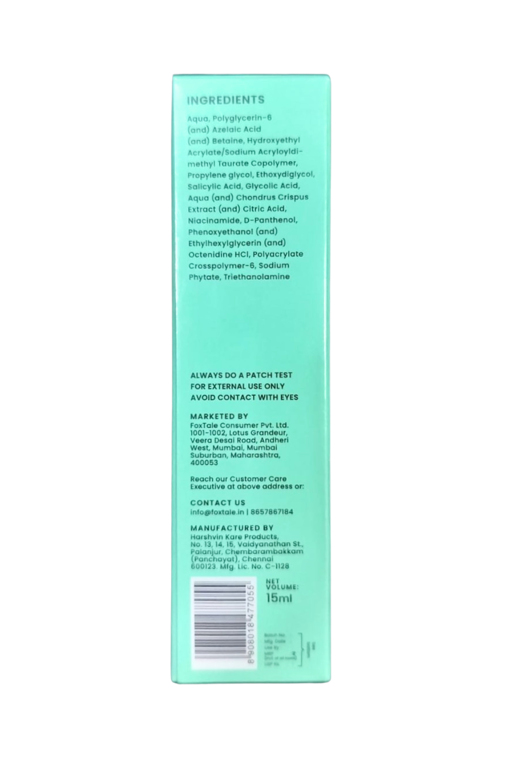 Imported & Marketed By: Foxtale Consumer Pvt. Ltd. 1001-1002, Lotus Grandeur, Veera Desai Road, Andheri West, Mumbai, Surban, Maharashtra, 400053