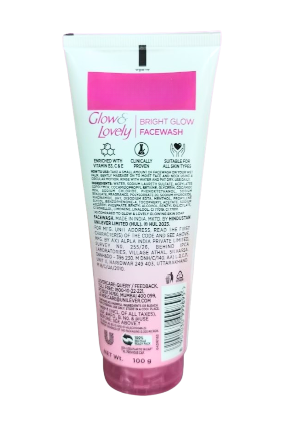 New Glow and Lovely Bright Glow Facewash is clinically proven to reduce tan and wash away impurities like dirt and pollution to give you instantly bright skin. Designed by experts, it is enriched with the goodness of 3x multivitamins* including Vitamin B3(Niacinamide), Vitamin C and Vitamin E which goes deep within the layers of your skin to wash away tan & dirt to give you a bright and glowing skin with every wash. It's gentle Soap-free formula is suitable for all skin types. (Dry, Oily, Combination). For best results, use twice a day in the morning and evening. For a good skin care regime moisturise with Glow & Lovely Advanced Multivitamin Face Cream afterwards. This dermatologically tested facewash formula is proven to wash tan.