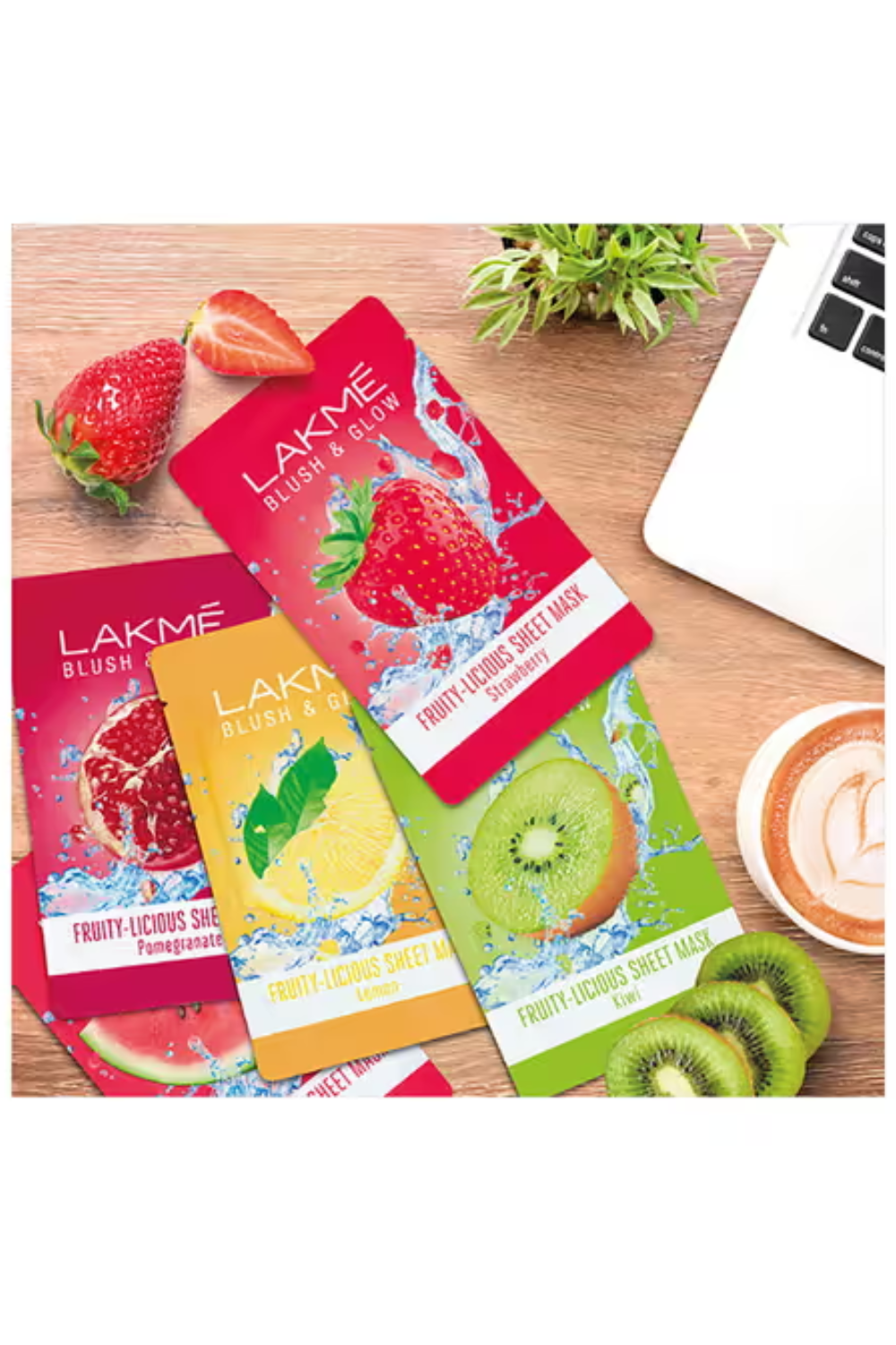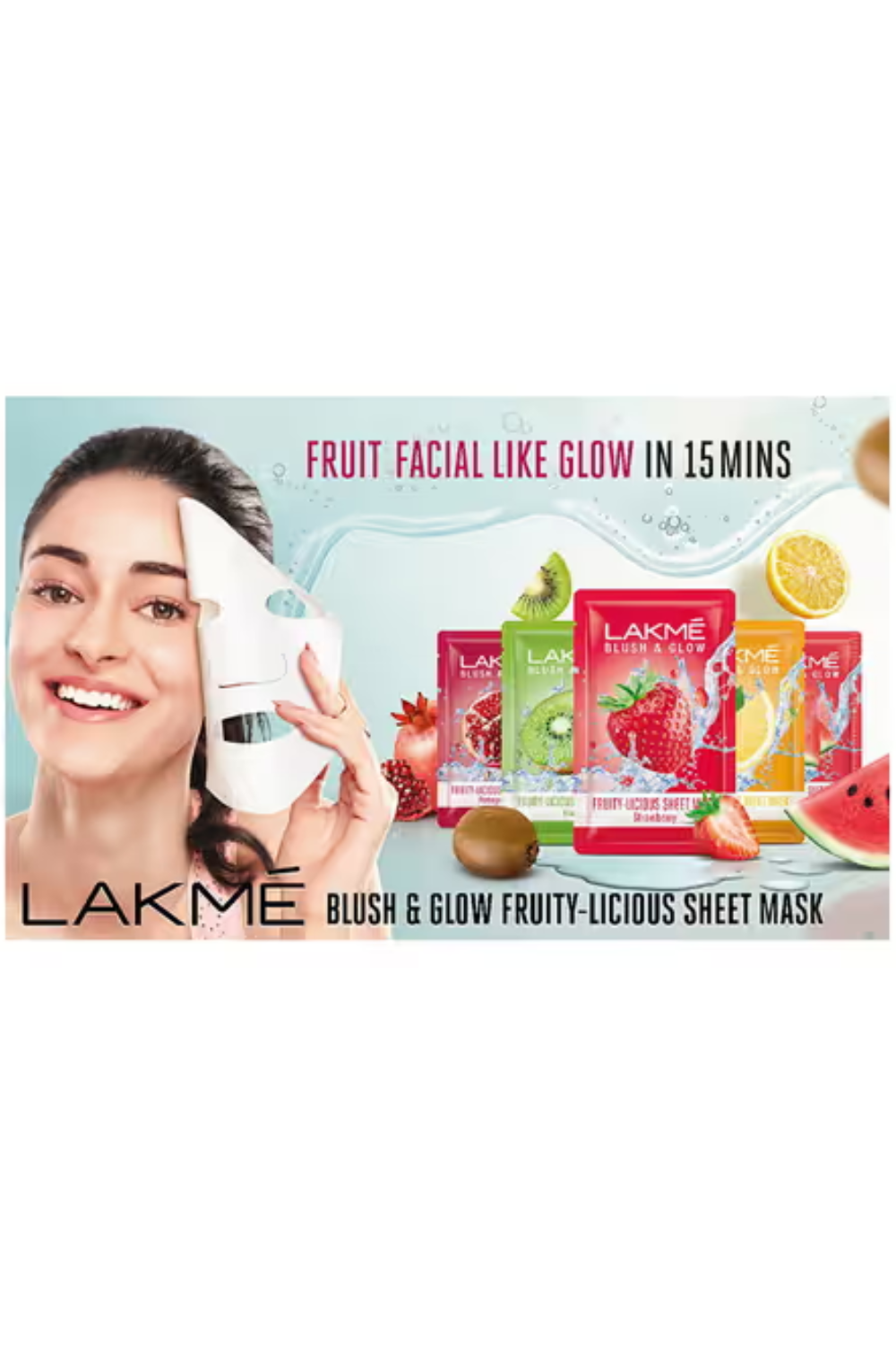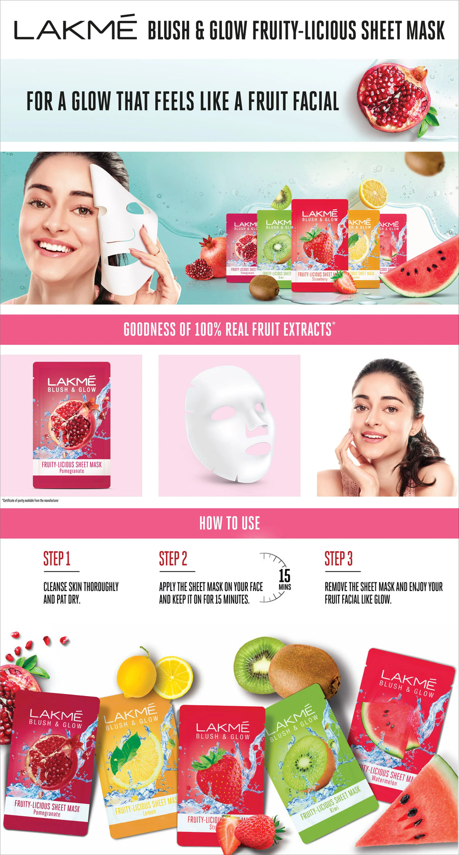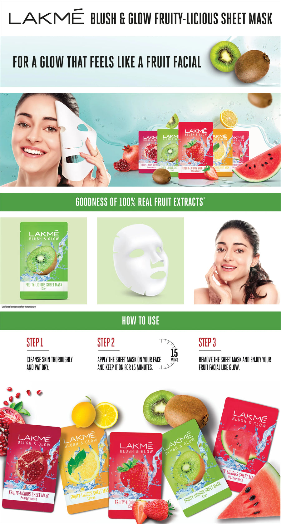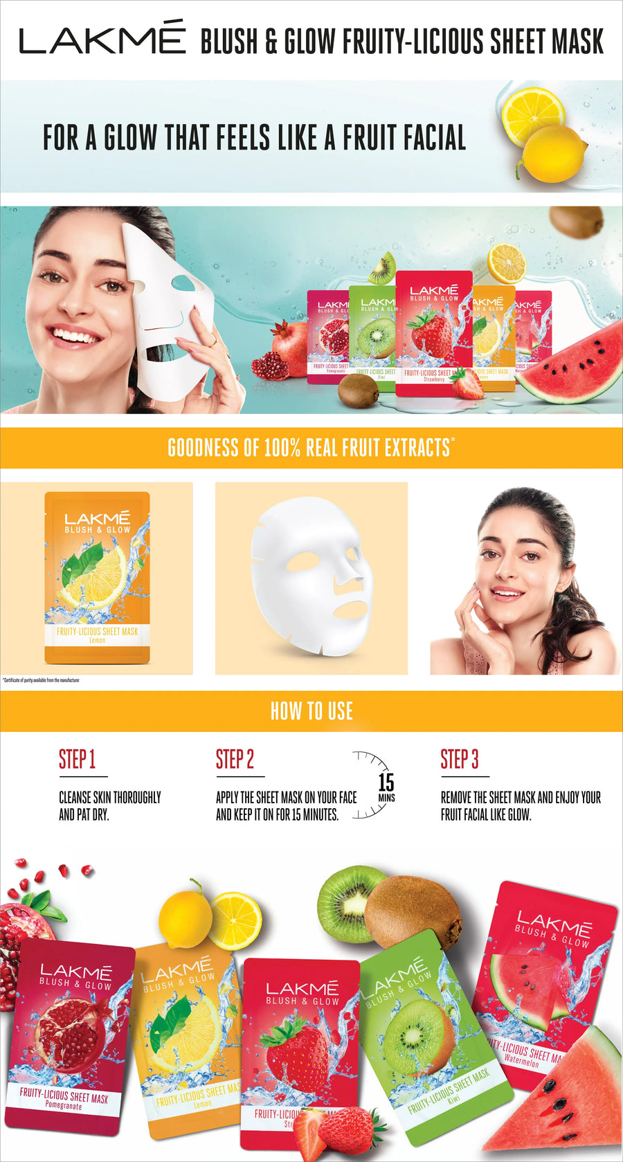 Lakme brings to you its first range of exciting Sheet Masks from blush and glow. If you are facing dull, dry, patchy skin that is yearning for some hydration that is infused with the goodness of your favourite fruits. If your skin wants to get a glow that feels like a fruit facial. Our sheet masks are meant to give you exactly that! Now soak your face in the goodness of 100% pure fruit extracts with the range of Lakme Blush & Glow Fruity-licious Sheet Masks. As you leave on this delightfully refreshing sheet mask, your face gets a burst of freshness and a gorgeous fruit-kissed glow. In just 15 minutes you feel rejuvenated like just out of a fruit facial. What’s more, the light, breathable fabric fits your face perfectly and smells oh! so delicious. It’s the ultimate way to pamper and nourish your skin and make it look fresh and feel soft and supple.