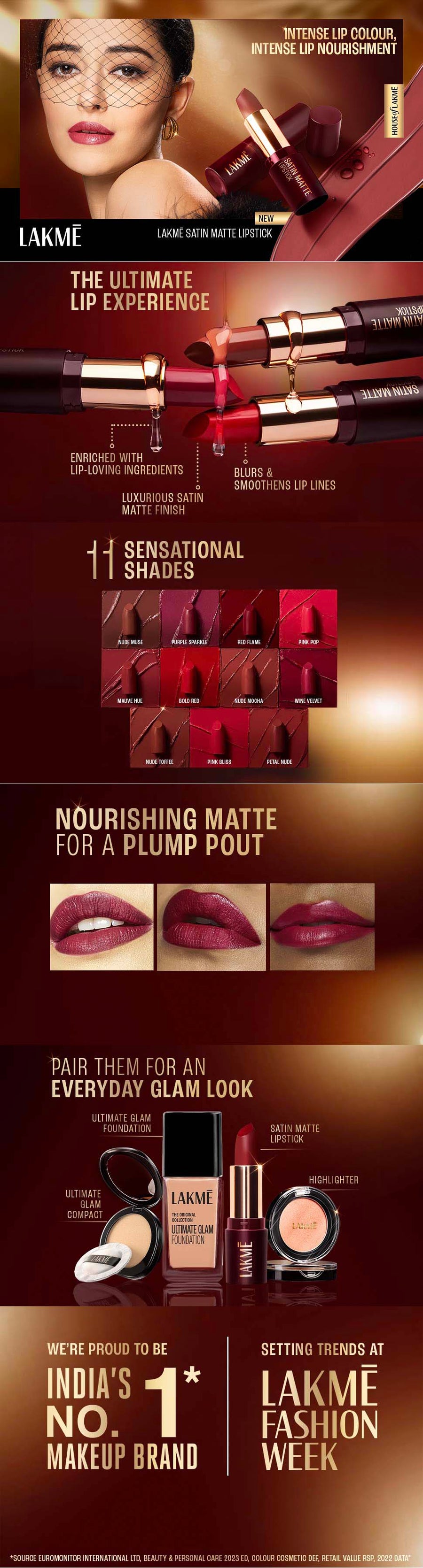 Description: Presenting the new Lakmé Cushion Matte Lipstick. An exclusive new matte lipstick with a revolutionary soft matte formula that makes matte lips feel soft and comfortable. This soft matte lip colour has an intense colour payoff that gives lips a matte yet soft focus effect. The soft matte formula is enriched with rose oil extracts from France which give your matte lips a moisturized, comfortable feel. It’s non-drying formula doesn’t dry your lips and leaves them feeling soft and looking intensely matte. The new Lakmé Cushion Matte Lipstick cushions your lips in a single stroke with its smooth and creamy application. To get an even and uniform matte finish on your lips, start by defining your cupid’s bow, then smoothly glide the lipstick to the other edge of both your upper and lower lips. Lakmé Cushion Matte is a water resistant soft matte lipstick that gives you a long lasting intense matte color and cushion soft lips all day. Choose from 35 vibrant matte shades and wear cushiony soft lips for a variety of occasions. To complete your soft matte look, pair your cushion matte lips with Lakmé Eyeconic Lash Curling Mascara, and Lakmé Impact Eyeliner. Try it now !