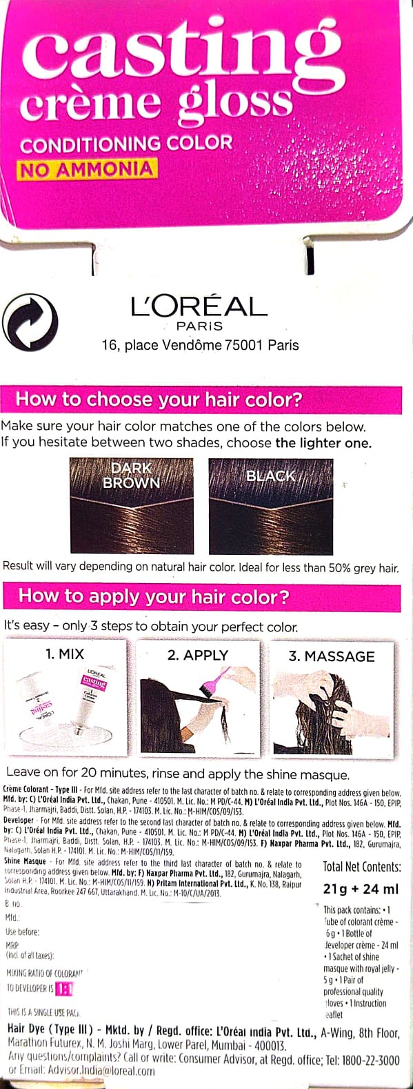 L'Oreal Paris Casting Creme Gloss is a no ammonia hair colorant that gives your hair visible shimmering tones, glossy shine and covers greys. It gives natural looking colour with visible shimmering tones and a glossy shine. Gives you the richness of natural colour that lasts up to 28 shampoos. Gentle, caring conditioner to provide nourished, satin soft, voluptuous hair. Easy, clean and pleasurable application with the non-drip crème formula in just 20 minutes, even for beginners. The delicate fragrance makes colouring a luxurious treat.