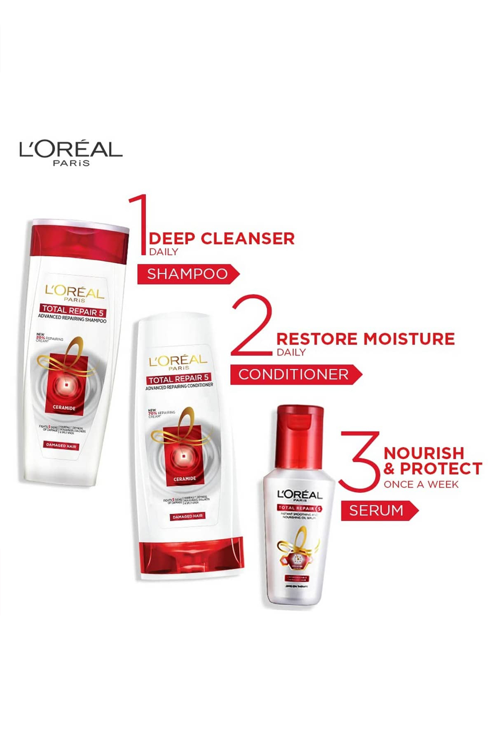 This Combo Includes :1. L'Oreal Paris Total Repair 5 Shampoo, 650 mlDermatologically Tested  2. L'Oreal Paris Total Repair 5 Conditioner, 180 mlDermat...