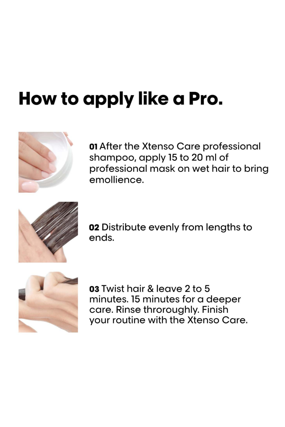 Step 1: After shampooing the hair, apply 15-20 ml of professinel masque on wet hair to bring emollience.