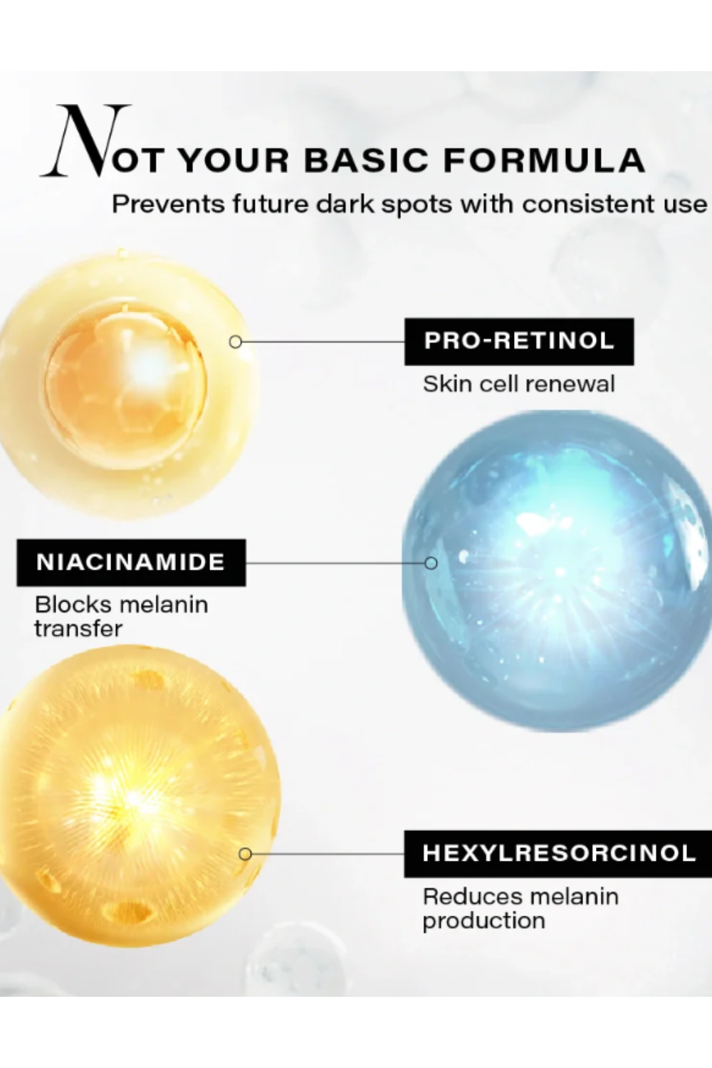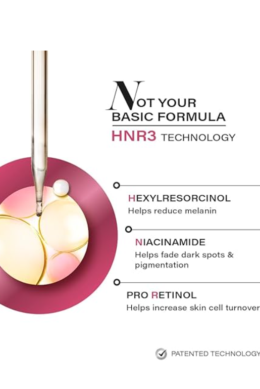 This easy-to-use serum features the patented HNR3 technology with 3.7% Hexylresorcinol, Niacinamide, and Retinyl Propionate. It targets dark spots, evens skin tone, and boosts cell renewal. The lightweight, non-sticky formula absorbs quickly without clogging pores, making it gentle and comfortable for everyday use