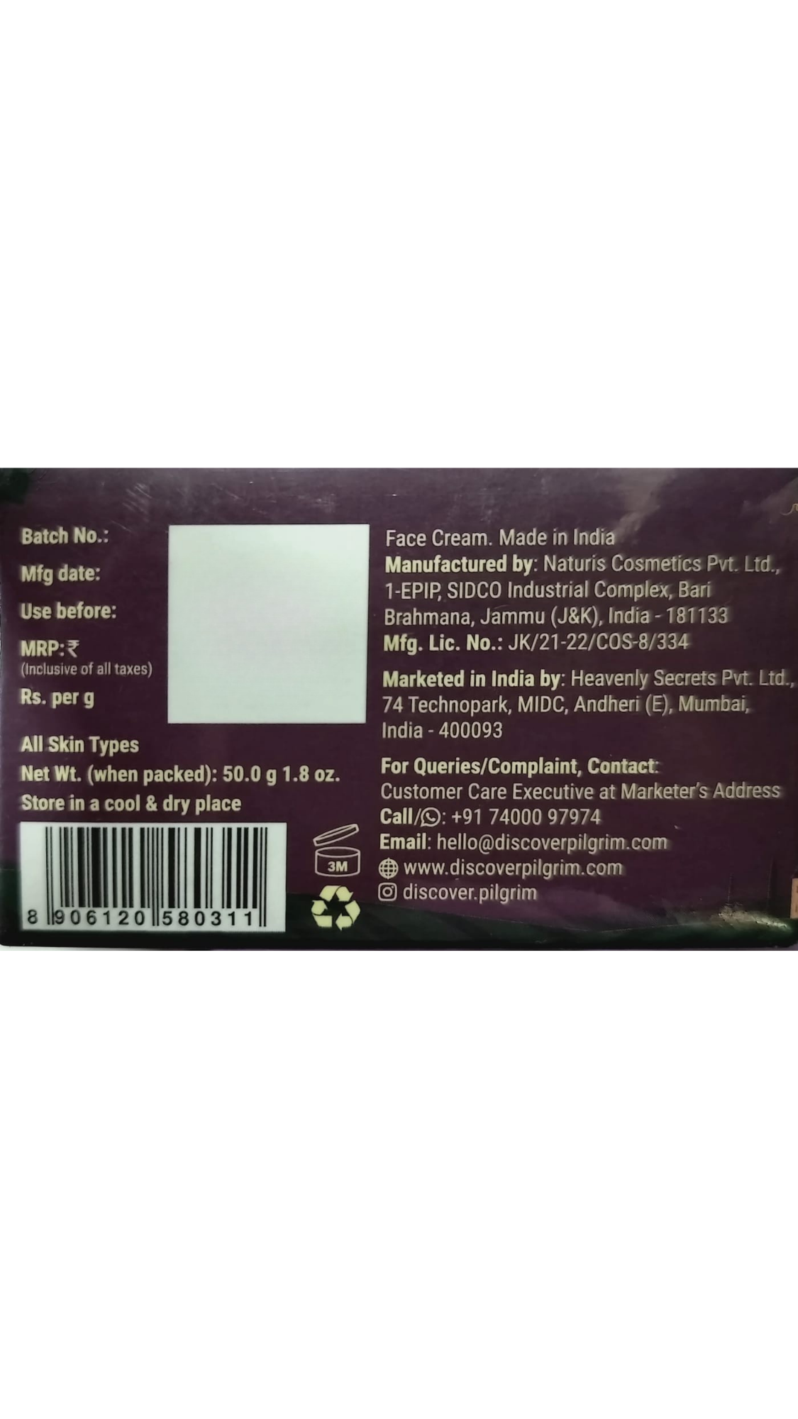 Manufactured By: Naturis Cosmetics Pvt. Ltd. 1-EPIP, SIDCO Industrial Complex, Bari Brahmana, Jammu (J&K), India -181133