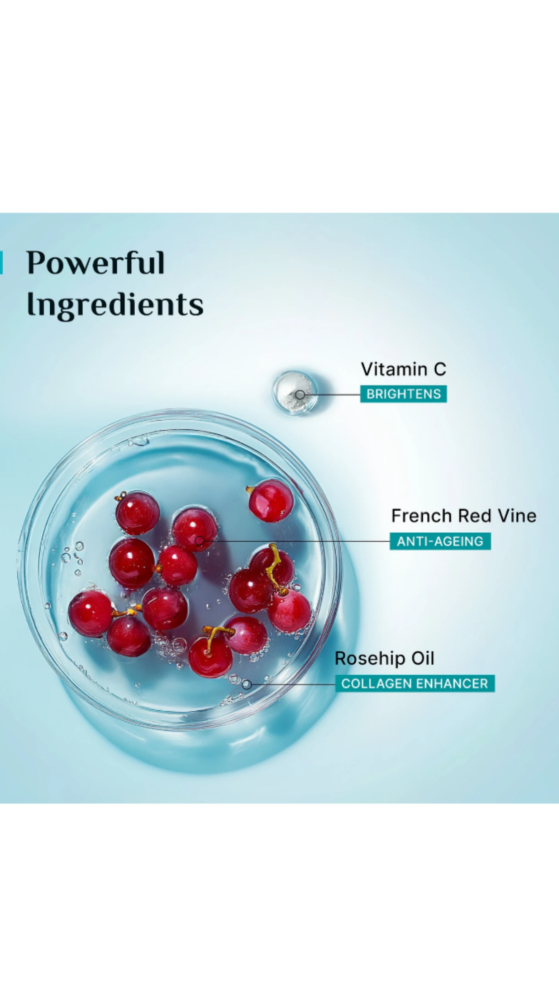 Purified Water, Olea Europaea (Olive) Oil, Ethylhexyl Methoxycinnamate, Buty Methoxydibenzoylmethane, Octocrylene, 1,3 Butylene Glycol, Glycerin, Caprylic/Capric Triglyceride, Propanediol, Vitis Vinifera (Grape) Leaf Extract, Phenoxyethanol, Ethylhexylglycerin, Polyacrylate-13, Polyisobutene, Polysorbate 20, Cetostearyl Alcohol, Acrylates/C10-30 Alkyl Acrylate Crosspolymer Rosa Canina (Rosehip) Seed Oil, Sodium Ascorbate, Tocopherol, Retinol, Sodium Gluconate Pentaerythrityl Tetra-Di-T-Butyl Hydroxyhydrocinnamate, Heptyl Glucoside, Perfume, CI.16185 C.I. 15985.
