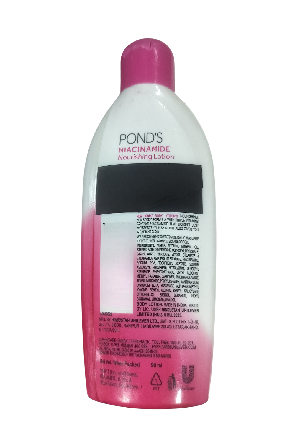 - Take a few pumps of POND'S Niacinamide Nourishing Body Lotion, apply generously on your clean or freshly washed skin, and spread it evenly using your palms.
