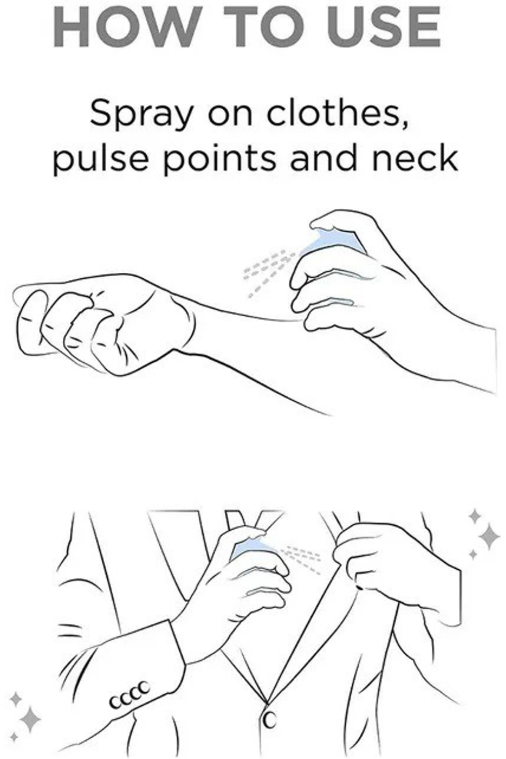 Step 2: Spray directly on the underarms and neck area. Do not spray on eyes, broken skin, bruises, cuts, burns etc.