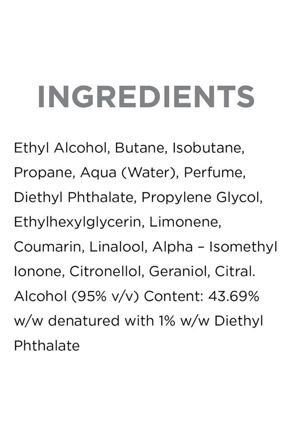 Alcohol, Water, Aluminum Chlorohydrate, Propylene Glycol, PEG-40 HydrogenatedCastor Oil, Fragrance, Glycerin,Hydroxyethylcellulose, 2-Methyl 5-Cyclohexylpentanol, Aloe BarbadensisLeaf Juice, Glycyrrhiza Glabra (Licorice) Root Extract, Glyceryl Caprylate, PerseaGratissima (Avocado) Fruit Extract, BHT, Tetrasodium EDTA, Sodium Ascorbyl Phosphate, Linalool, Limonene,Coumarin, Citronellol, Hydroxycitronellal.