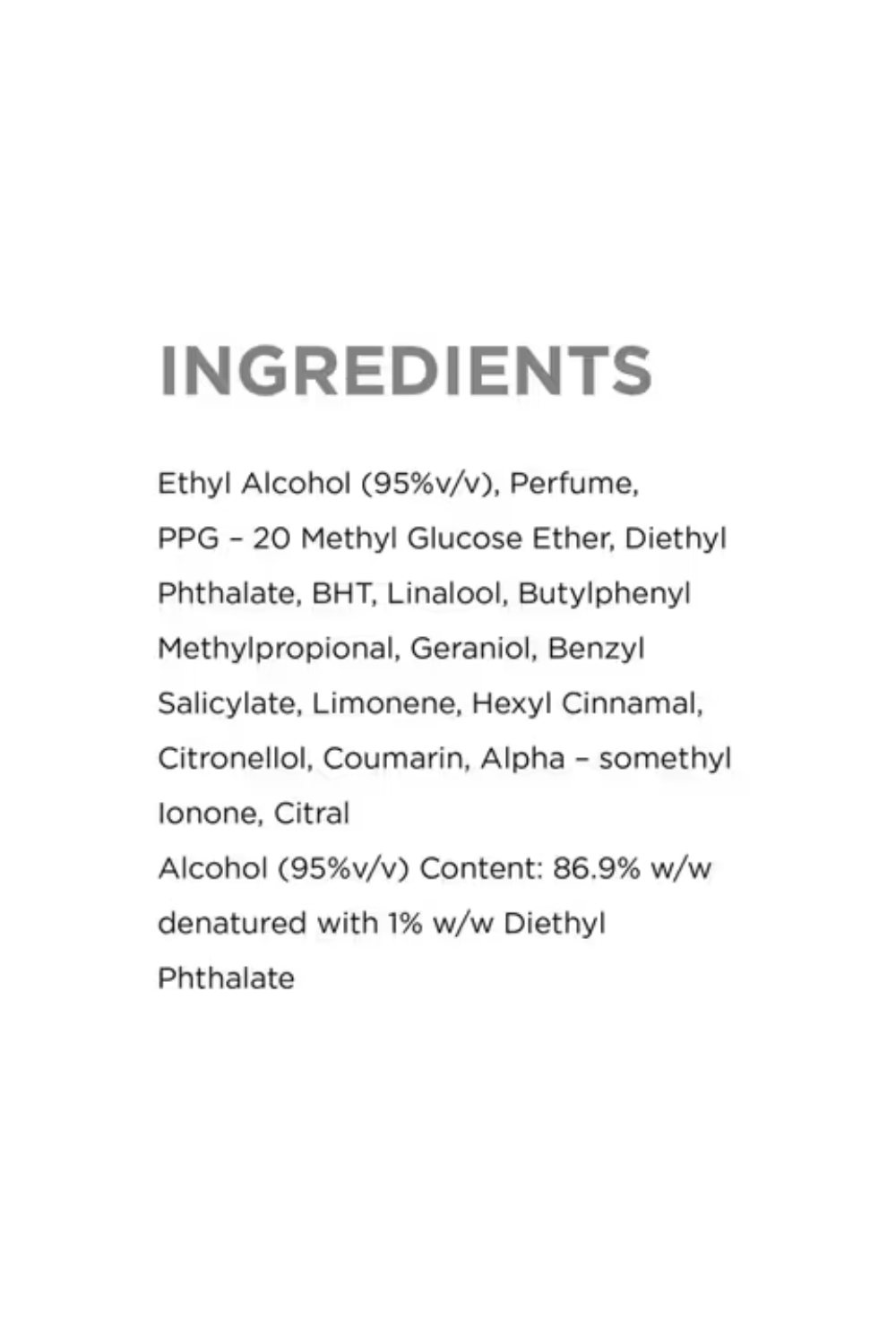 EthylAlcohol(95%V/V), Perfume,Ppg-20MethylGlucoseEther, DiethylPhthalate, Bht, Linalool, ButylphenylMethylpropional, Geraniol, BenzylSalicylate, Limonene, HexylCinnamal, Citronellol, Coumarin, Alpha-IsomethylIonone, Citralalcohol(95%V/V) Content:86.9%W/W Denatured With 1%W/W DiethylPhthalate