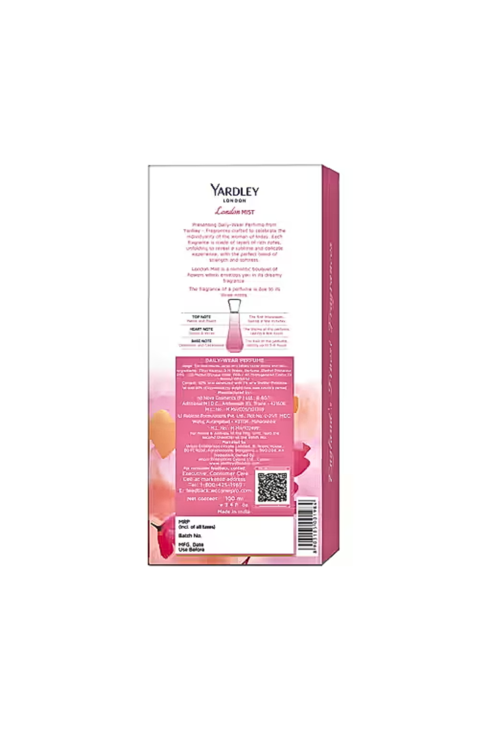 Get a light, rejuvenating fragrance with the Yardley London London Mist Daily Wear Perfume (100ml). Formulated with natural ingredients, this refreshing perfume controls odor so you can be confident that you are always smelling divine. Also, the Yardley London perfume is infused with cinnamon, cyclamen, and melonto exude a fruity fragrance to refresh the senses.