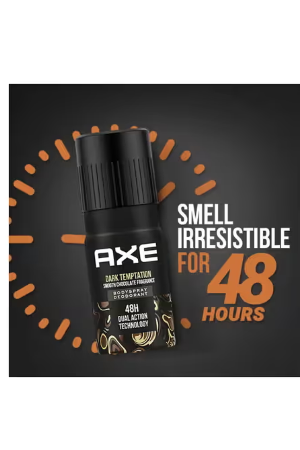 Smooth Chocolate Fragrance instant Cooling EffectKeep smelling fresh for hours with the Axe Dark Temptation 48H Dual Action Deodorant Body Spray For Men - (150ml). It has a rich chocolate fragrance that lasts for upto 48 hours. This Axe body spray has a cooling technology to cool you down instantly by six degrees. It is paraben-free to ensure safe use.