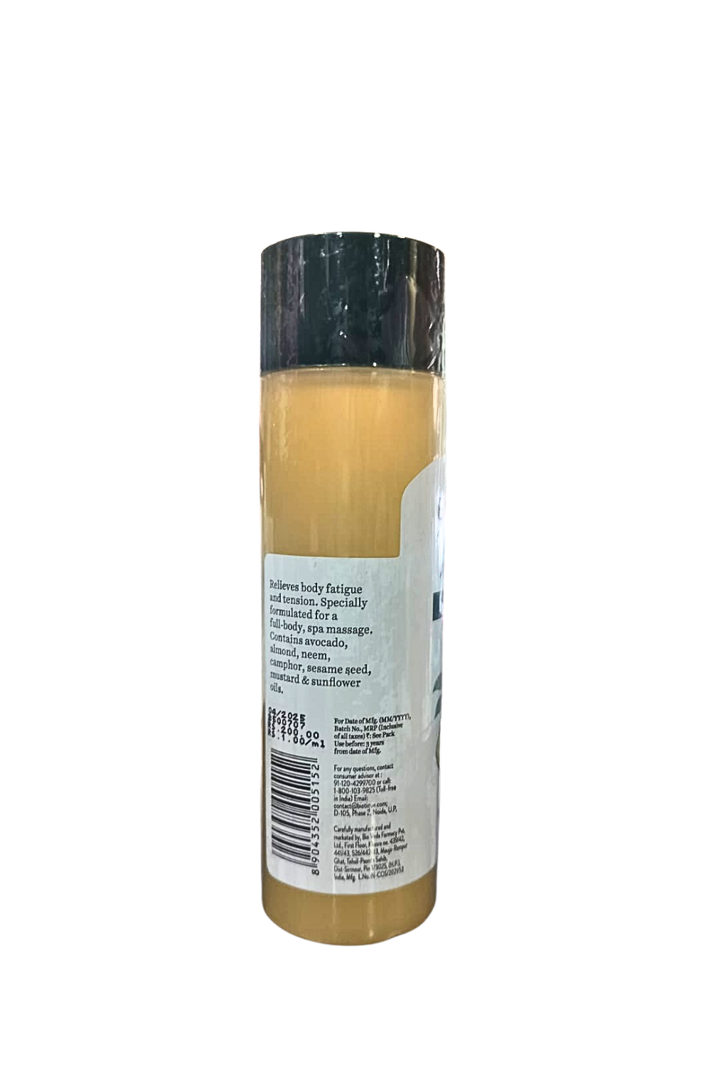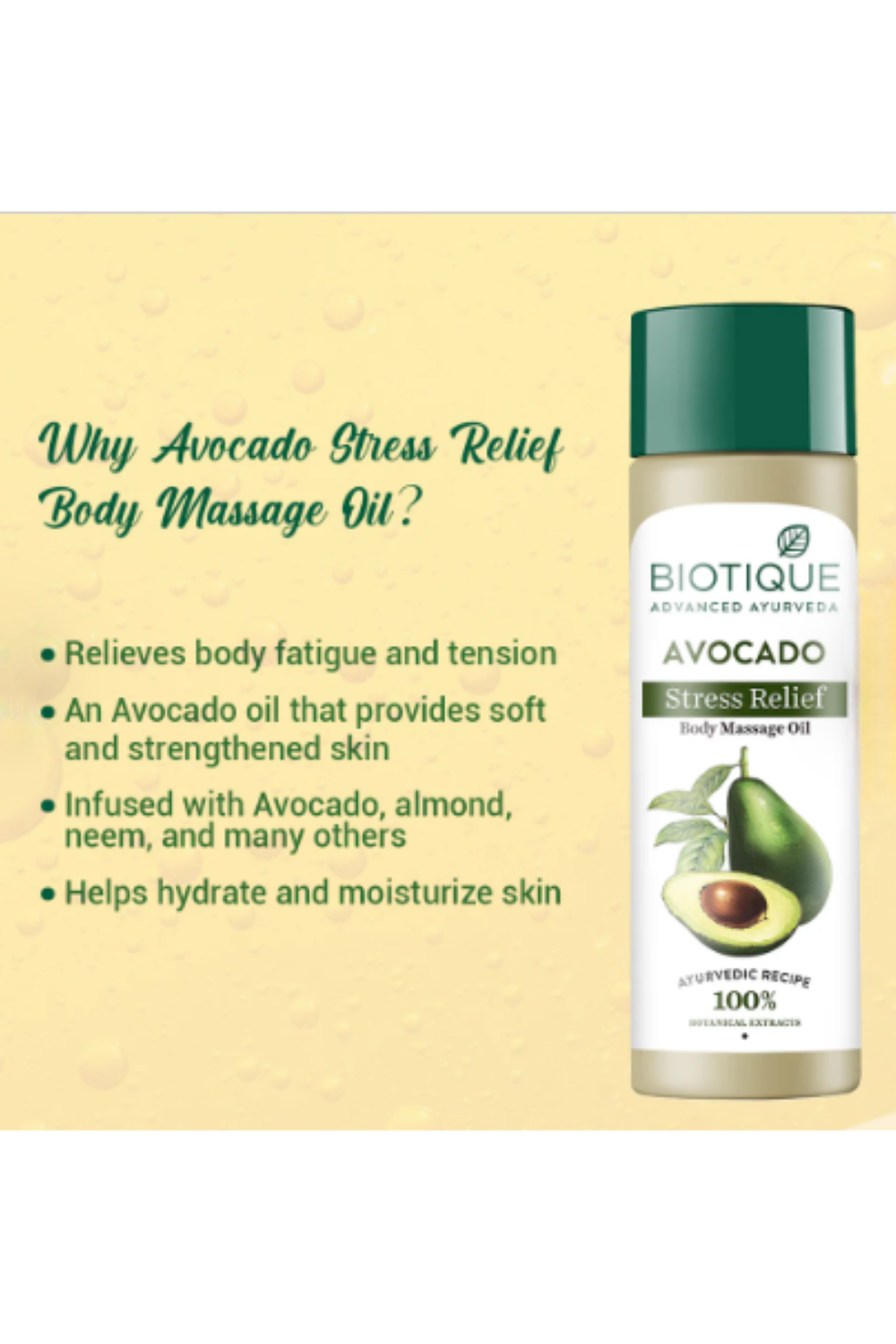 Relieves body fatigue and tension. Specially formulated for a full-body, spa massage. Contains avocado, almond, neem, camphor, sesame seed, mustard & sunflower oils. Biotique Cado Stress Relief Avocado Stress Relief Body Massage Oil, crafted to provide ultimate nourishment and healing for your skin. Our specially formulated ayurvedic body massage oil is enriched with a blend of powerful ingredients, designed to restore your skin's vitality and promote overall well-being. Our avocado massage oil is enriched with almonds, a powerful antioxidant that nourishes and revitalizes the skin. Neem, known for its soothing properties, provides relief for sensitive skin. Additionally, avocado heals and moisturizes chapped skin, leaving it smooth and hydrated. Biotique body massage oil strengthens and softens the skin, relieves body fatigue and tension, alleviates stress, rejuvenates tired muscles, and provides relief and relaxation. It also deeply hydrates the skin, replenishing moisture and promoting a healthy glow. Our stress relief massage oil is made from 100% natural botanical extracts, ensuring that it is free from harmful chemicals that can harm your skin and overall health. Dermatologically tested and suitable for all skin types. Use our fatigue relief oil for easy and convenient relief. Massage onto wet skin, and rinse well. Add a few drops of carrier oil for hair and skin. Or add it to bathwater for a relaxing experience.