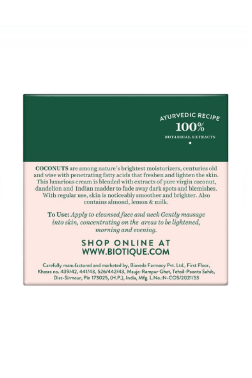 Brand Information: A combination of the 5,000-year-old science of Ayurveda and 21st-century biotechnology. A dream that has today become a global reality. We are synonymous with serious skin and hair care developed from Ayurveda, the principal medical tradition in India for over 5000 years. Longer than long ago, health and beauty were fleeting. The average adult life expectancy was 30 years old, as nature took its toll. Then, 5000 years ago, Aryan sages in India searched within the vast resources of nature to extend this ephemeral existence. Biotique products are based on the authentic Ayurveda recipes, taken from the ancient and original Veda texts, passed down from generation to generation, to our Founder Vinita Jain.