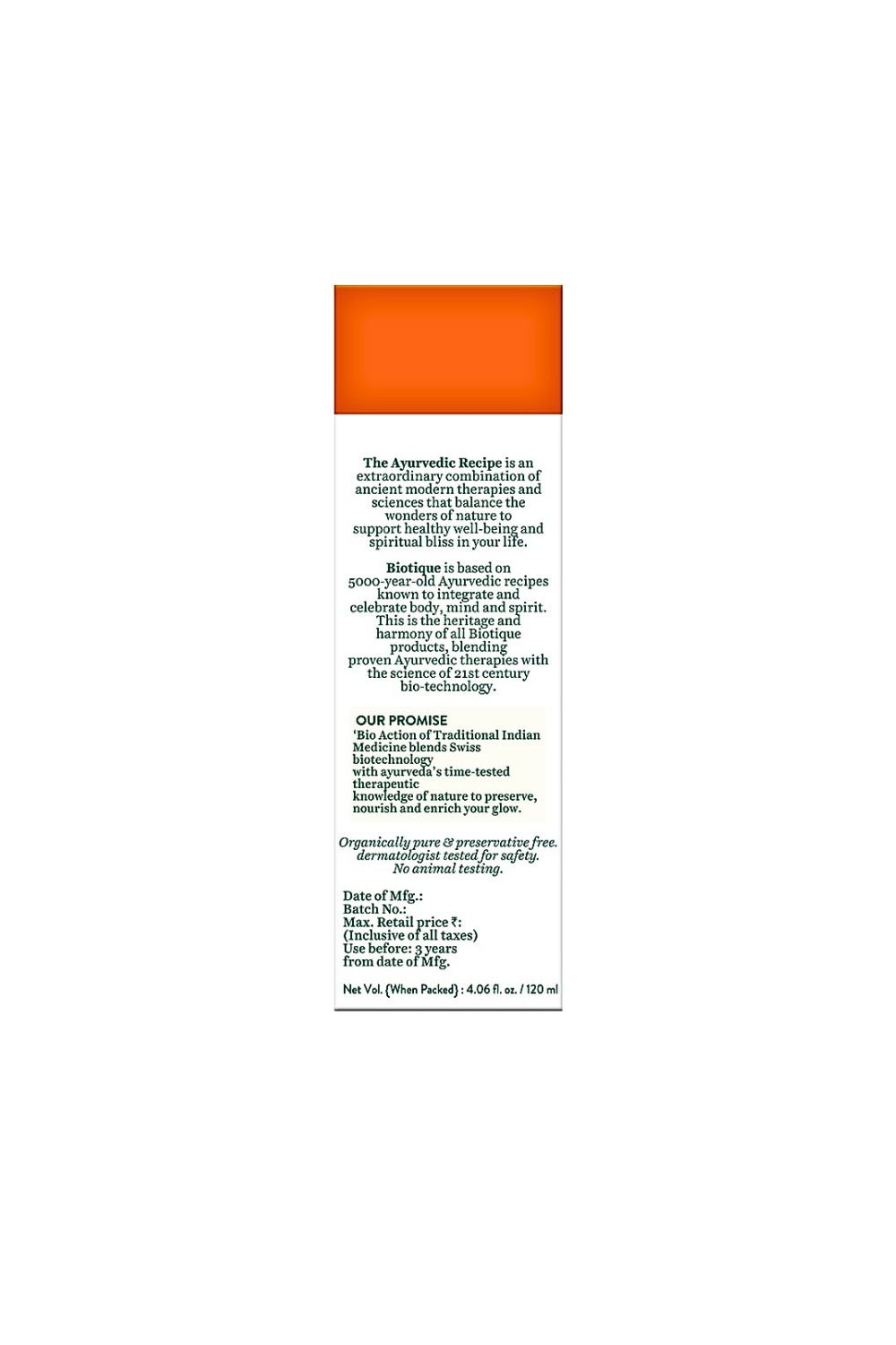 Brand Information: A combination of the 5,000-year-old science of Ayurveda and 21st-century biotechnology. A dream that has today become a global reality. We are synonymous with serious skin and hair care developed from Ayurveda, the principal medical tradition in India for over 5000 years. Longer than long ago, health and beauty were fleeting. The average adult life expectancy was 30 years old, as nature took its toll. Then, 5000 years ago, Aryan sages in India searched within the vast resources of nature to extend this ephemeral existence. Biotique products are based on the authentic Ayurveda recipes, taken from the ancient and original Veda texts, passed down from generation to generation, to our Founder Vinita Jain.