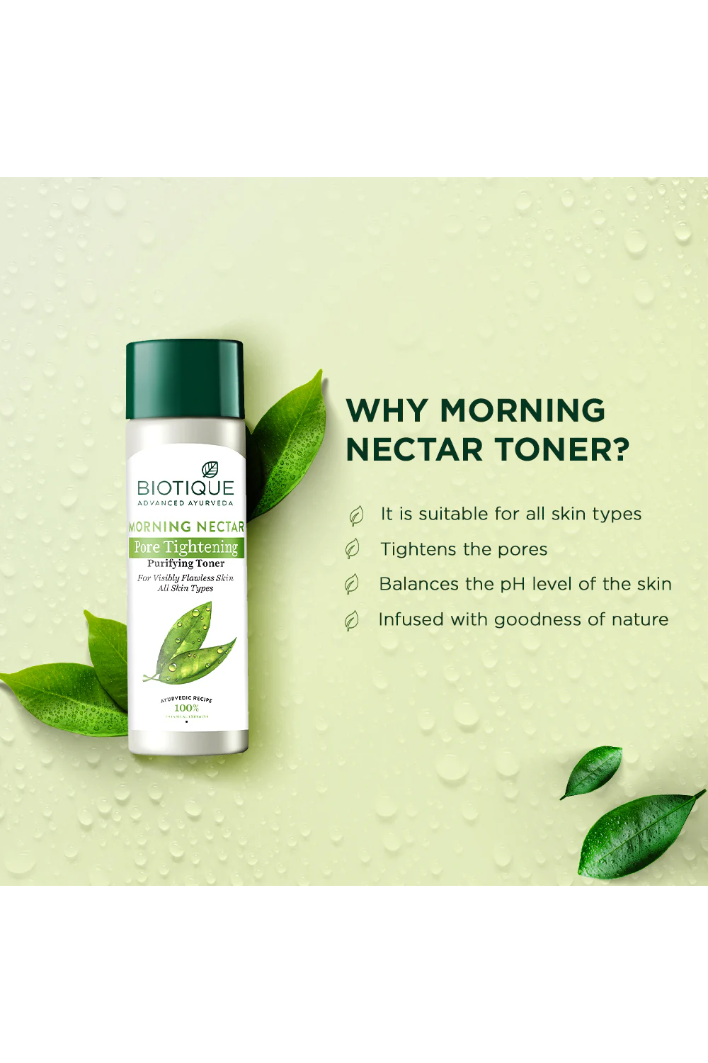 MORNING NECTAR Purifying Toner is nature’s greatest cooling, purifying, refreshing, pore tightening and purifying toner is blended with carrot seed, aloe vera, nutgalls, rose petals, manjistha, hibiscus flower, honey and the fresh waters found in the foothills of the himalayan water. It is formulated to bring the complexion into perfect pH balance and help keep skin in its purest state.