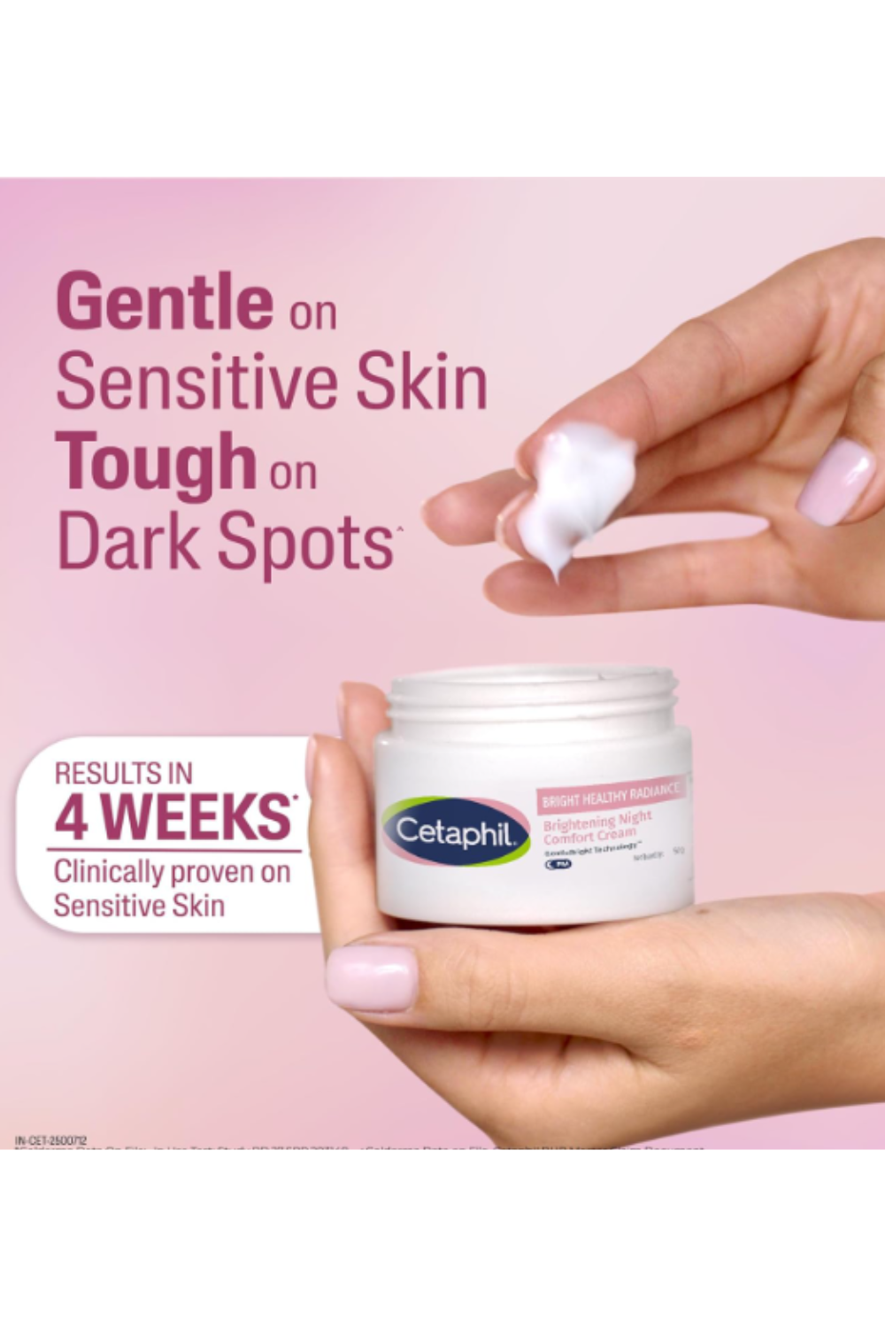 - CETAPHIL BRIGHT HEALTHY RADIANCE BRIGHTENING NIGHT COMFORT CREAM: Brightens and evens skin tone without irritating or weakening the skin barrier
