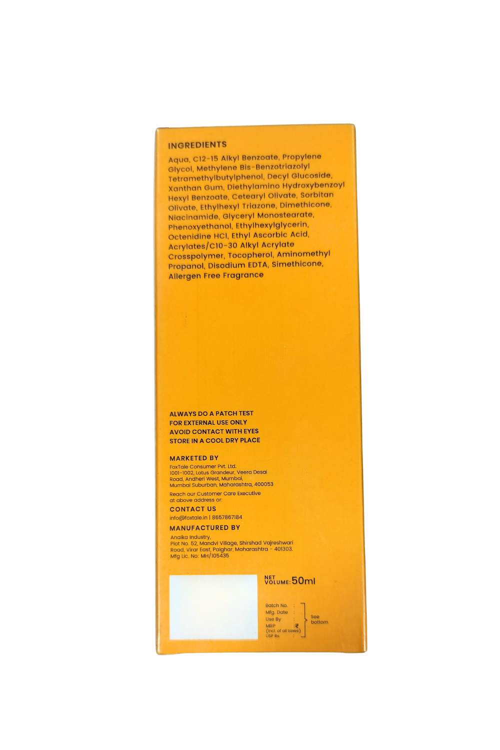 Marketed By: Foxtale Consumer Pvt. Ltd. 1001-1002, Lotus Grandeur, Veera Desai Road, Andheri West, Mumbai, Surban, Maharashtra, 400053