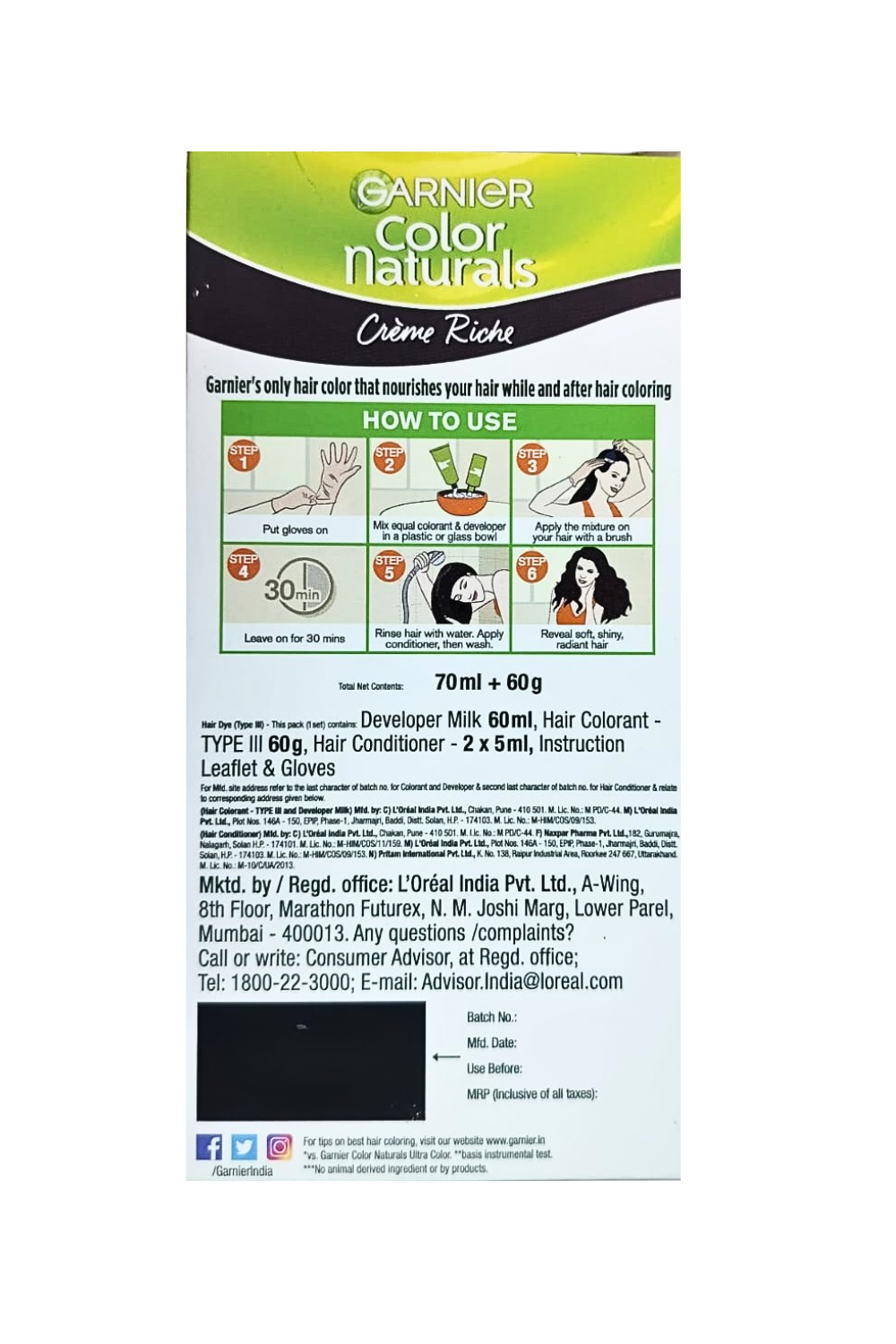 - LONG LASTING COLOR: The Garnier Color Naturals Darkest Brown hair color is equipped with an effective colour-lock technology that makes your hair color last upto 10 weeks.