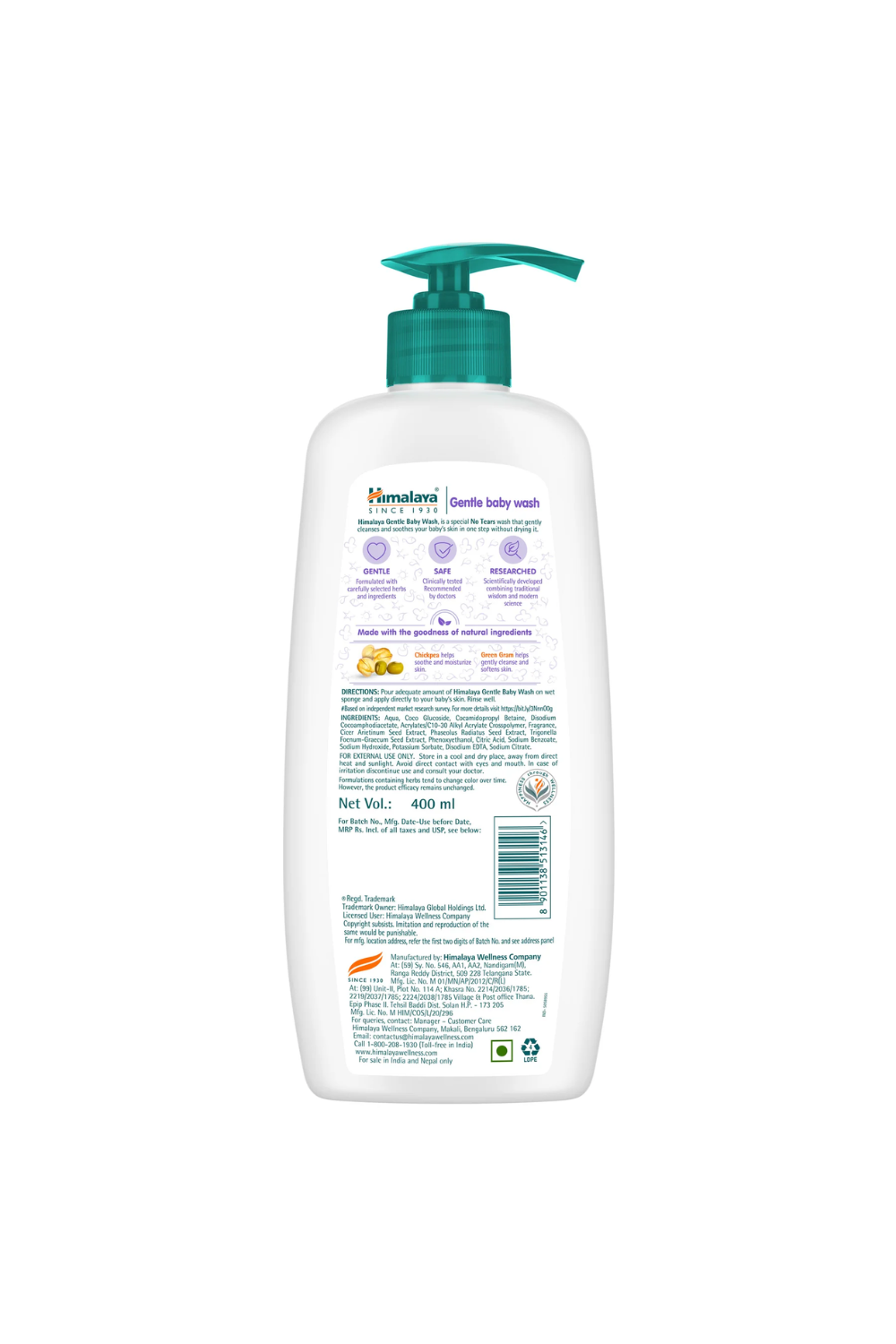 Description: Himalaya’s Gentle Baby Wash with its unique No Tears formula is infused with the goodness of Chickpea, Fenugreek and Green Gram which cleanses your newborn’s skin, gently. Soap free formula to gently cleanse baby’s skin Soothing cleanser for baby’s delicate skin For a mild and gentle bath
