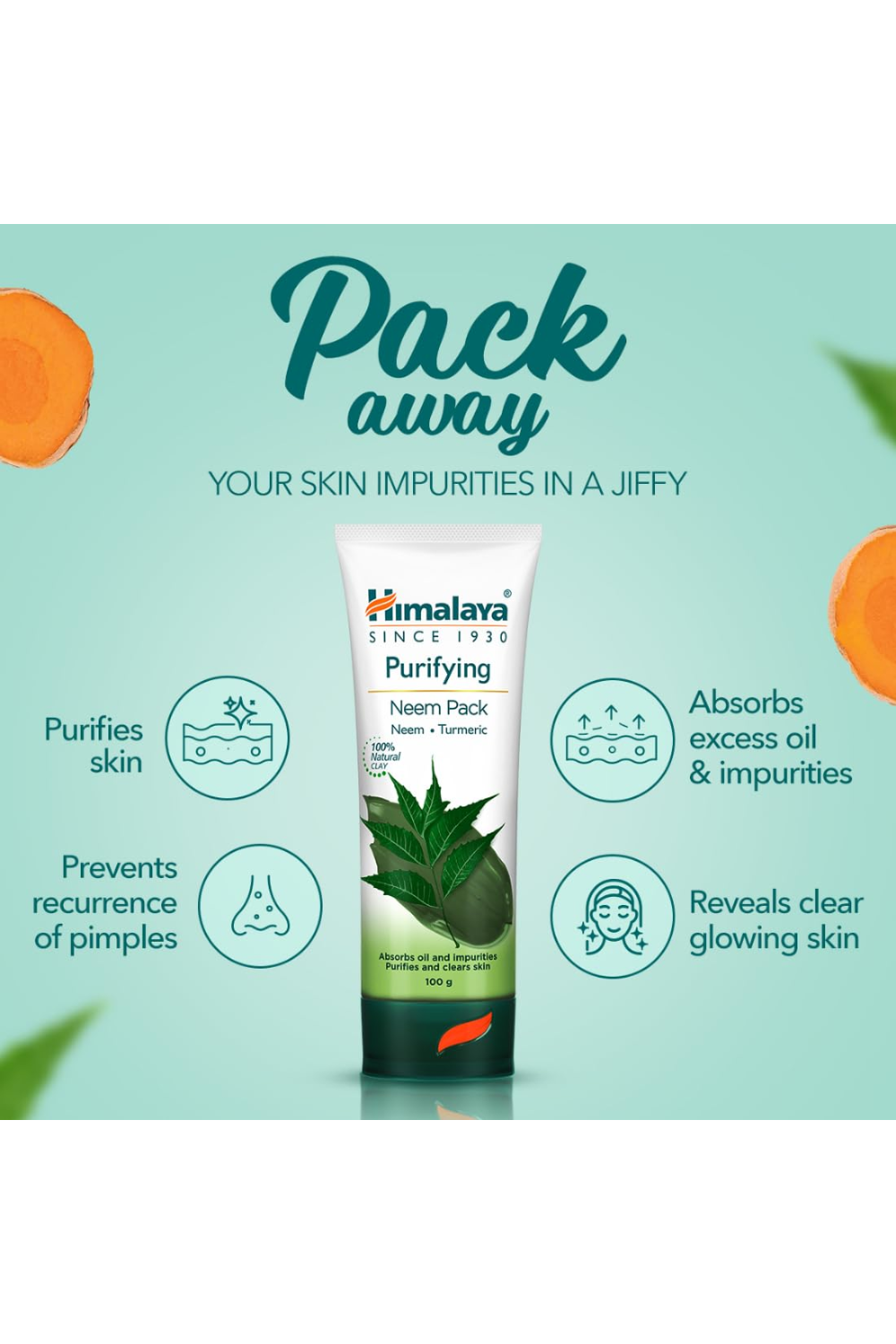 Description: Himalaya's Purifying Neem Pack brings together the goodness of Neem, Fuller's Earth, and Turmeric, which work together to remove excess oil, clean clogged pores, and helps prevent the recurrence of pimples.