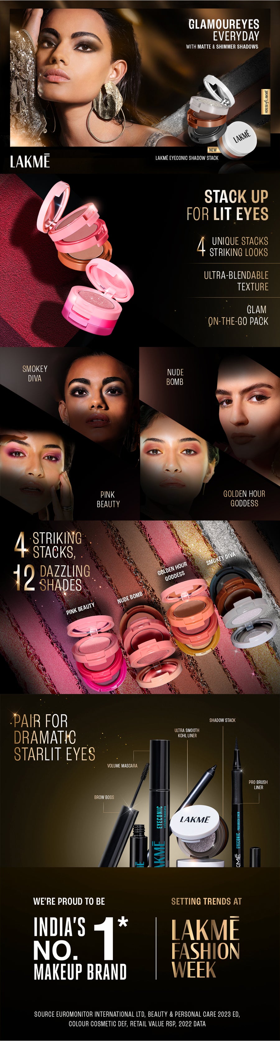Step into your sassy era with the Lakme Creme Powder Eyeshadow Stacks. It's not just eye makeup, it's your ultimate vibe-check for that flawless look....Step into your sassy era with the Lakme Creme Powder Eyeshadow Stacks. It's not just eye makeup, it's your ultimate vibe-check for that flawless look. In 4 sassy stacks, it's your magic hack to some eye-glam goals. Introducing Smokey Diva, Pink Beauty, Nude Bomb, and Golden Hour Goddess. Each stack creates intense eye drama with 1 shimmer and 2 matte shades. This on-the-go pack is legit the definition of chic: portable and powerful! Smokey Diva brings drama and boldness while Pink Beauty's all about that playful, flirty charm. Nude Bomb is your ticket to subtle yet sassy looks and Goldenhour Goddess will take you to goddess-level shimmer and shine. These colors blend like a dream, giving you that dramatic pop and an extra edge you need. To ace your eyeshadow game, sweep the lighter matte shade across for base. Next, define those lids with a darker shade in the creases. Elevate the look by swiping shimmer onto the inner lids or center for extra pop. Whether you’re all about that day-to-night transformations or aiming for the chic yet glam look, these Creme powder eyeshadow stacks are your must-have's. Time to slay is here, let your eyes do the talking!