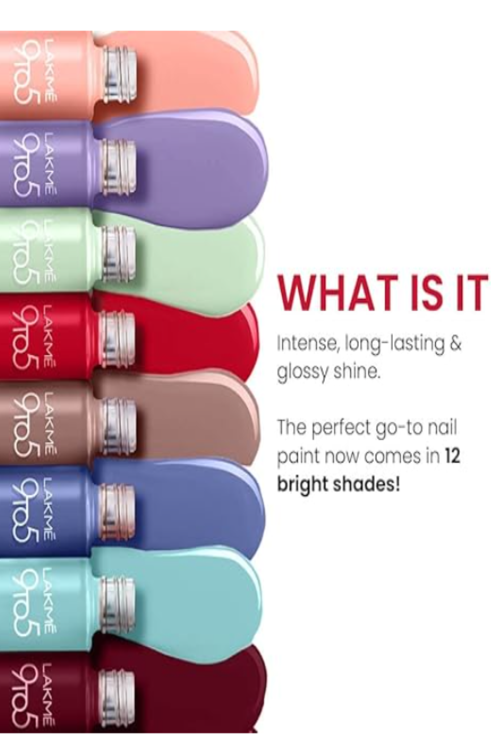 Get everyday perfect nails with Lakme 9to5 Primer + Gloss Nail Colour. Presenting the all new Lakme 9to5 Primer + Gloss Nail Colour range with colours that dry quickly, giving your nails a long lasting intense glossy shine. Now coat your nails with vibrant colour and an intense glossy shine that stays through your busy work days. Available in a wide range of 29 bright colours and 1 Top Coat that gives an added glossy finish. Colour for everyday use, the shades are simply a must-have! The Lakme 9to5 Primer + Gloss nail colour range will give you an everyday-perfect glossy look to your nails. To get perfect glossy nails, start by applying one coat of your desired nail colour. Wait between coats to get a smooth, dry layer. Apply the Top Coat to coat your nails with a glossy, chip-proof texture and give any nail colour a smooth, long-lasting glossy finish. You’re now ready to go with everyday-perfect glossy nails. Key features & Benefits: • Long-lasting colour that strengthens nails to keep colour fresher for longer • Intense glossy shine • Dries quickly • A range of vibrant colours • Zero yellowing of nails • Perfect for everyday use Go Glossy Everyday