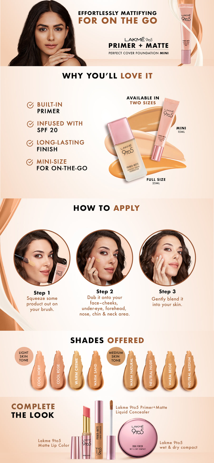 Lakme 9 To 5 Primer + Matte Perfect Cover Foundation is available in 16 shades that suit 100% of Indian skin tones, that looks as natural as your skin, whether it’s day or night. Choose from a range of shades available in Warm, Cool and Neutral undertone. This foundation gives you medium to high coverage as it is buildable in nature for your convenience and as per the occasion. With SPF 20 and longwear formula, this foundation will keep your skin looking natural and flawless through the day! Lakmé 9to5 Primer + Matte Perfect Cover Foundation is all about unleashing your natural self - the very best version of YOU. After all, your natural, is your perfect. So what are you waiting for? Go get it!