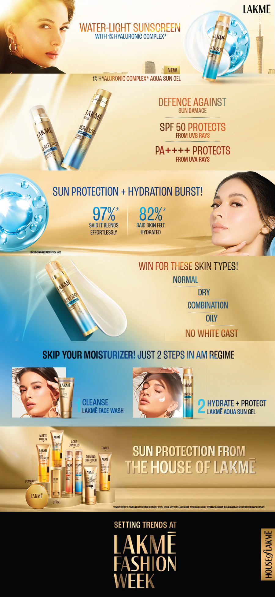 - Elevate your sun care routine with Lakmé's 1% Hyaluronic Complex Sungel—an ode to lightweight luxury and uncompromising sun protection."