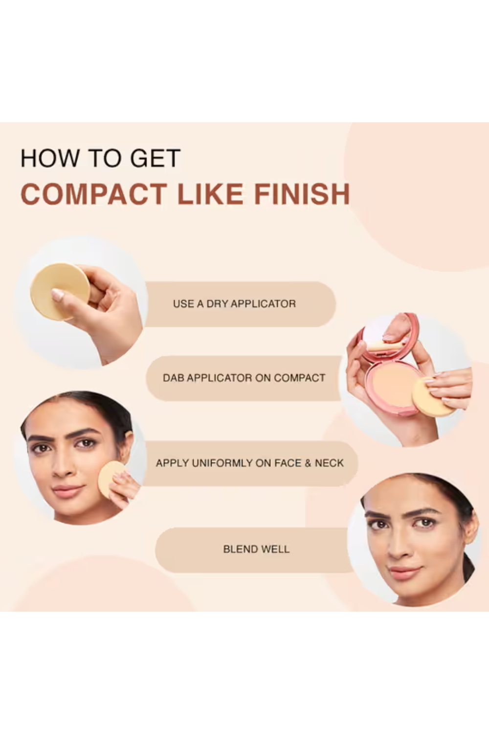 "One compact. Two Flaw-less Finishes. Move over regular compact - it's time for the new Lakmé 9to5 Dual-finish Compact. So innovative, you can use it as a compact when you want or a foundation when you need. Its unique formula can transform from an everyday compact to a full-coverage foundation in just a swipe. Damp the applicator with a water spray. Dab it into the compact and watch it transform magically into a foundation. It’s long-lasting, has a non-cakey finish, and feels ultra-lightweight on your skin. The powdery dry compact gives a fresh & natural everyday coverage. While the foundation finish is perfect for a glam day out. Available in 8 shades, the Lakmé 9to5 Dual-finish Compact is also easy to use and convenient to carry. The pocket-friendly pack fits effortlessly into your purse and comes with an easy applicator, making it convenient to get flawless skin on the go! It’s easy-to-blend formula sits comfortably on your skin. While its innovative dual technology makes it the perfect new addition to your makeup kit. From a long day at work to a night on the town, the new Lakmé 9to5 Dual-finish compact transforms with your mood and gives you a flawless finish, every single time."