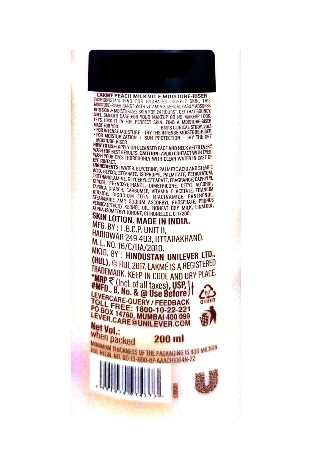 Lakme Peach Milk Vit E Moisture-Riser is a blend of wholesome peaches and milk, which nourishes the skin deeply without making it appear oily. This light moisturizer with its soothing fragrance will make you fall in love with it instantly. This lotion easily absorbs into the skin to lock moisture for 12 hours to give you soft, smooth and glowing skin