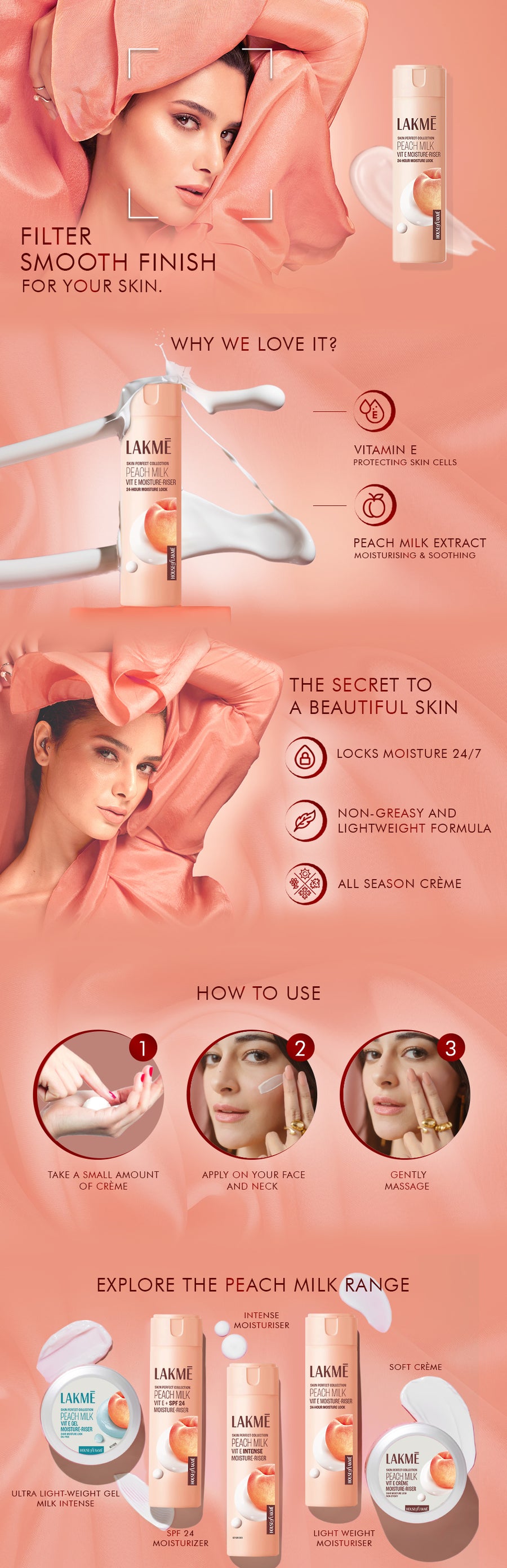 "Is your skin loosing moisture as the day goes by ? Lakme brings to you a moisturizer which is a blend of wholesome peaches and milk which nourishes the skin deeply without making it appear oily. This light moisturizer with its soothing fragrance will make you fall in love with it instantly. This lotion easily absorbs into the skin to lock moisture for 12 hours to give you soft|| smooth and glowing skin. Choose the right Peach Milk Moisturizer: for light nourishment pick this classic lotion. For intense nourishment - try the Peach Milk Winter lotion. For nourishment with sun protection|| try the Peach Milk SPF lotion. For best results - use everyday for nourished skin that glows. About Lakme: Lakme is India’s No.1 Color Cosmetics brand offering a wide range of high-end|| world-class color cosmetic and skincare products. Lakme has a vast product range specially crafted by experts for the Indian skin. The brand has also been redefining fashion in India for over 15 years with Lakme Fashion Week|| India’s premier fashion event. Allergies: In the unlikely event of skin irritation|| stop using and consult a doctor immediately. Warning: Avoid contact with eyes. Wash your eyes thoroughly with clean water in case of contact. *OLD"