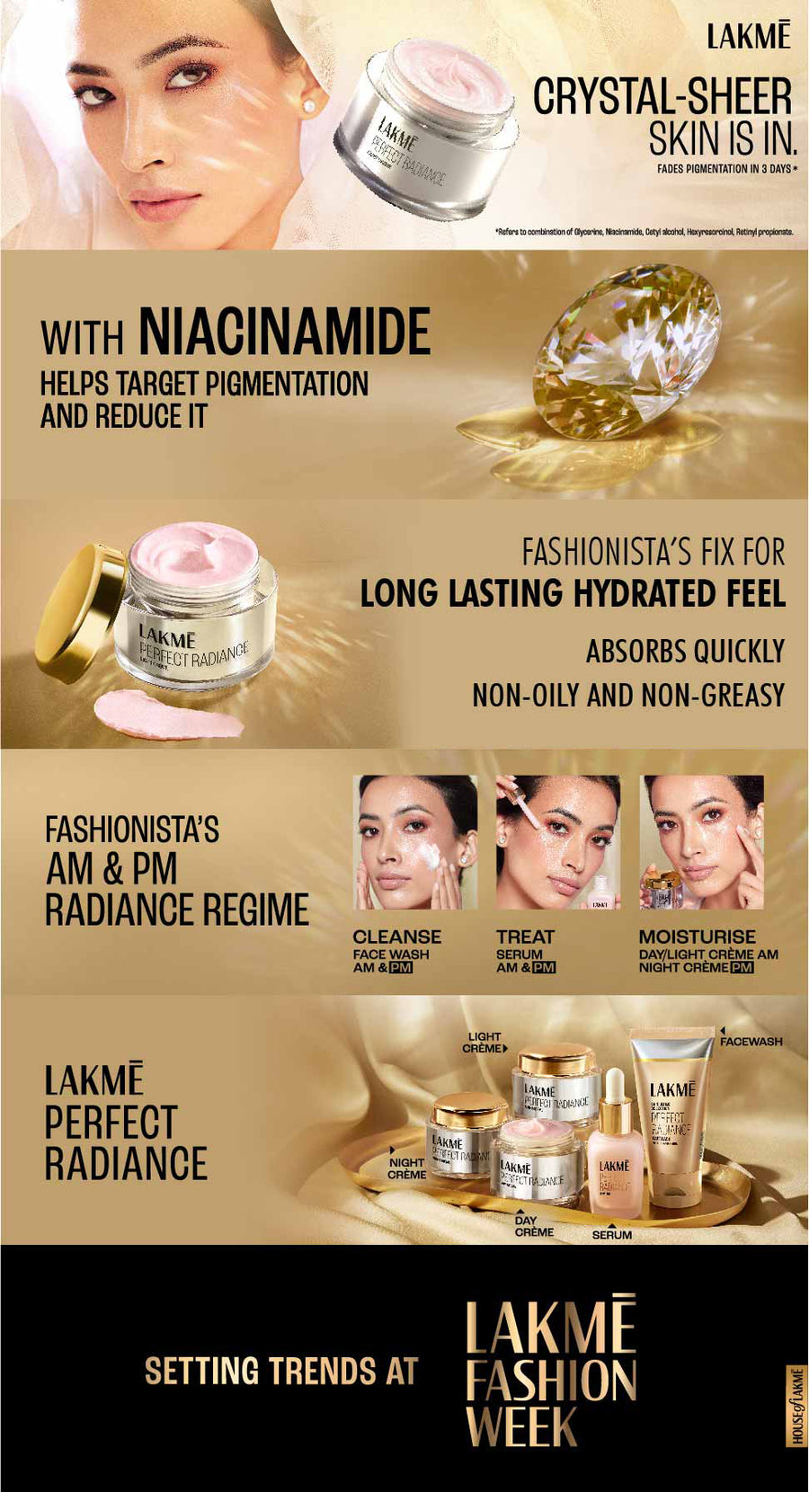 Inspired by the illuminate trend, Lakme ’s Perfect Radiance range is now elevated to a new level of luxury and efficacy. The high-resolution clarity of a crystal is now captured in the New Lakme Absolute Perfect Radiance range. Lakme Absolute Perfect skin Brightening crème with precious micro-crystals and skin illuminating vitamins gives you a fair, illuminated look.