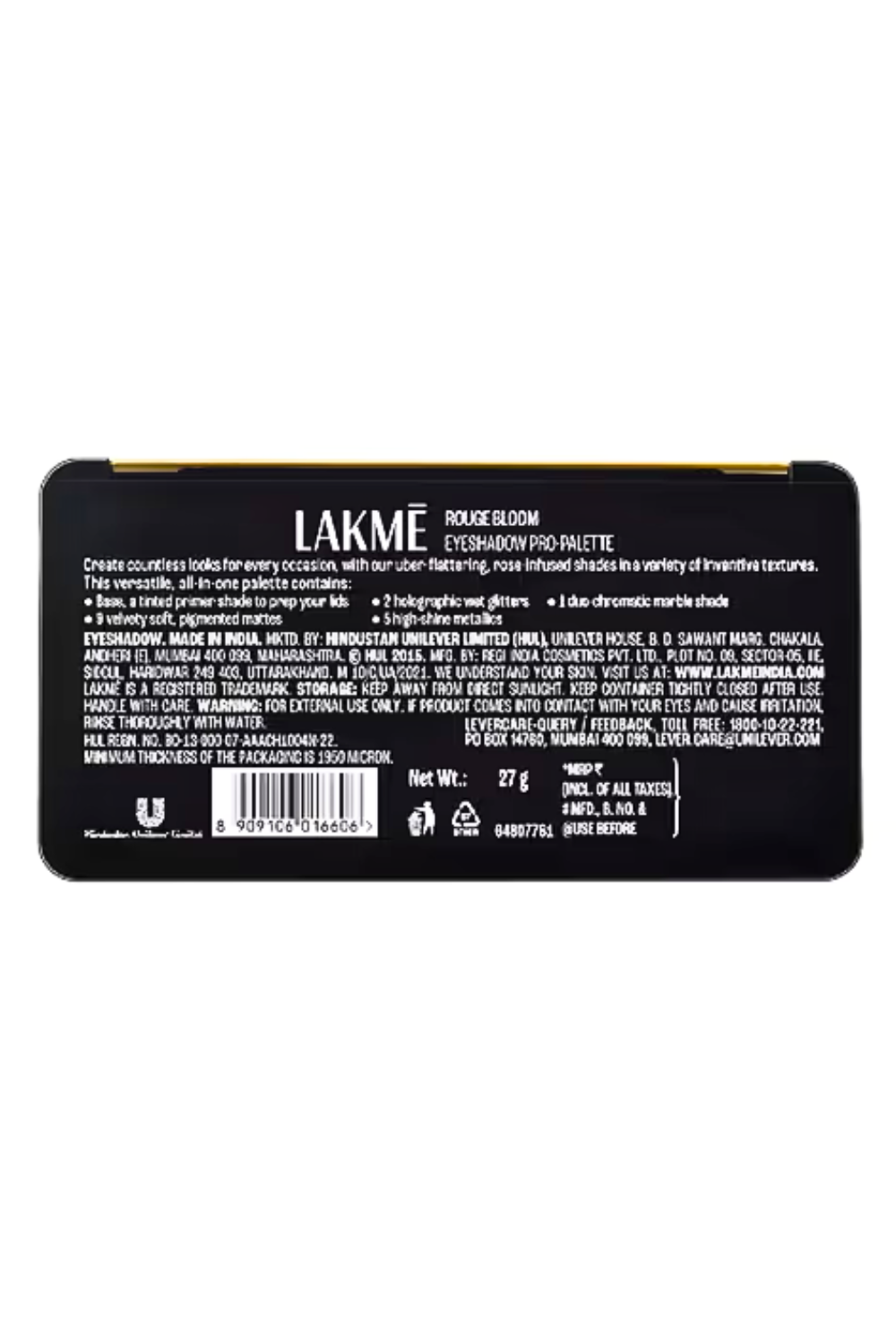 Embrace a ritual of luxury with the Lakme Rouge Bloom Eyeshadow Pro-Palette (27 g). This artistic eyeshadow palette contains 18 pans in six different textures, including holographic, metallic, foil, marble, matte, and wet glitters for varied eye looks. The Lakme eyeshadow palette is enriched with rose oil to soften and moisturize the eyelids. Plus, this ergonomic eyeshadow palette has a large built-in mirror for on-the-go use.