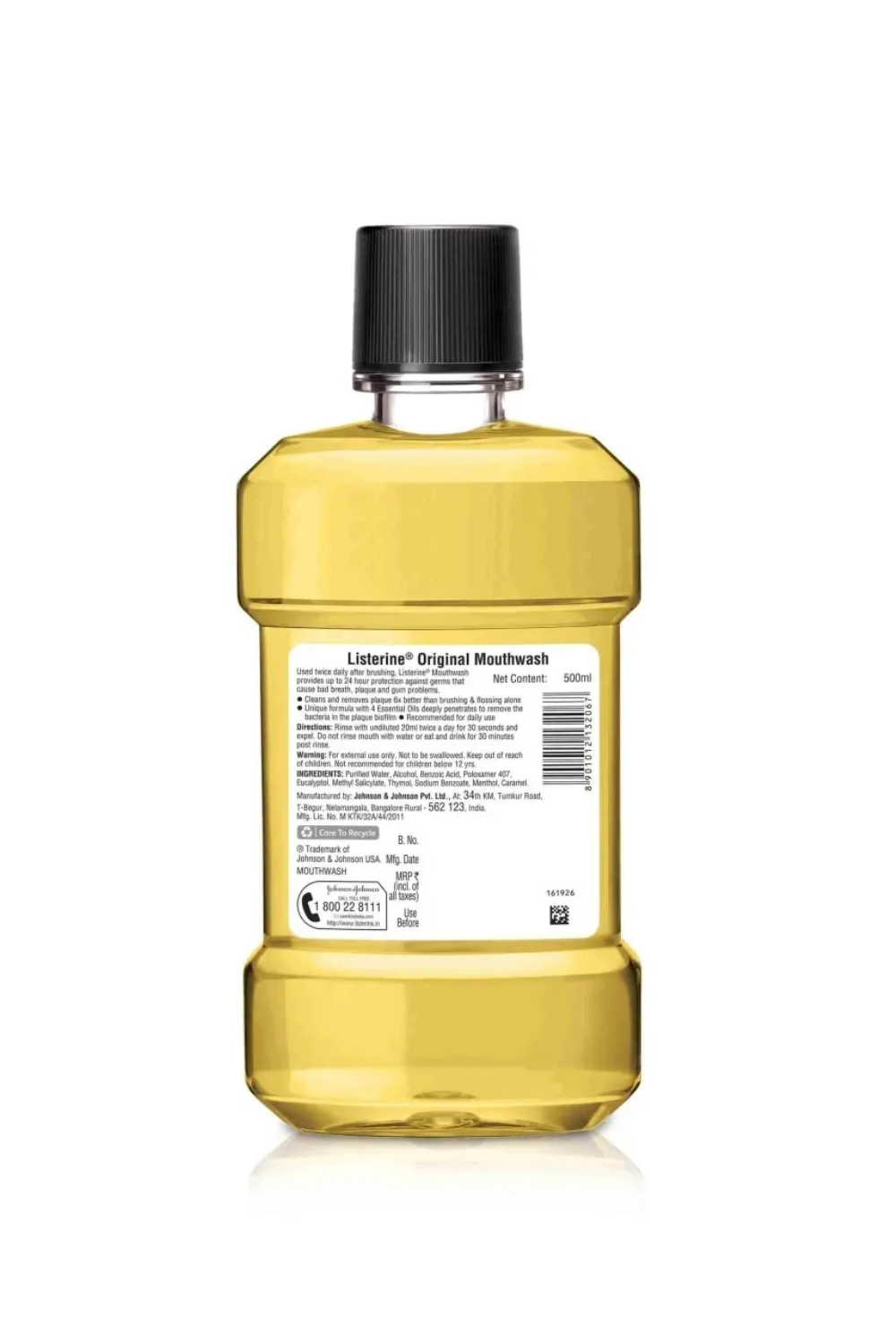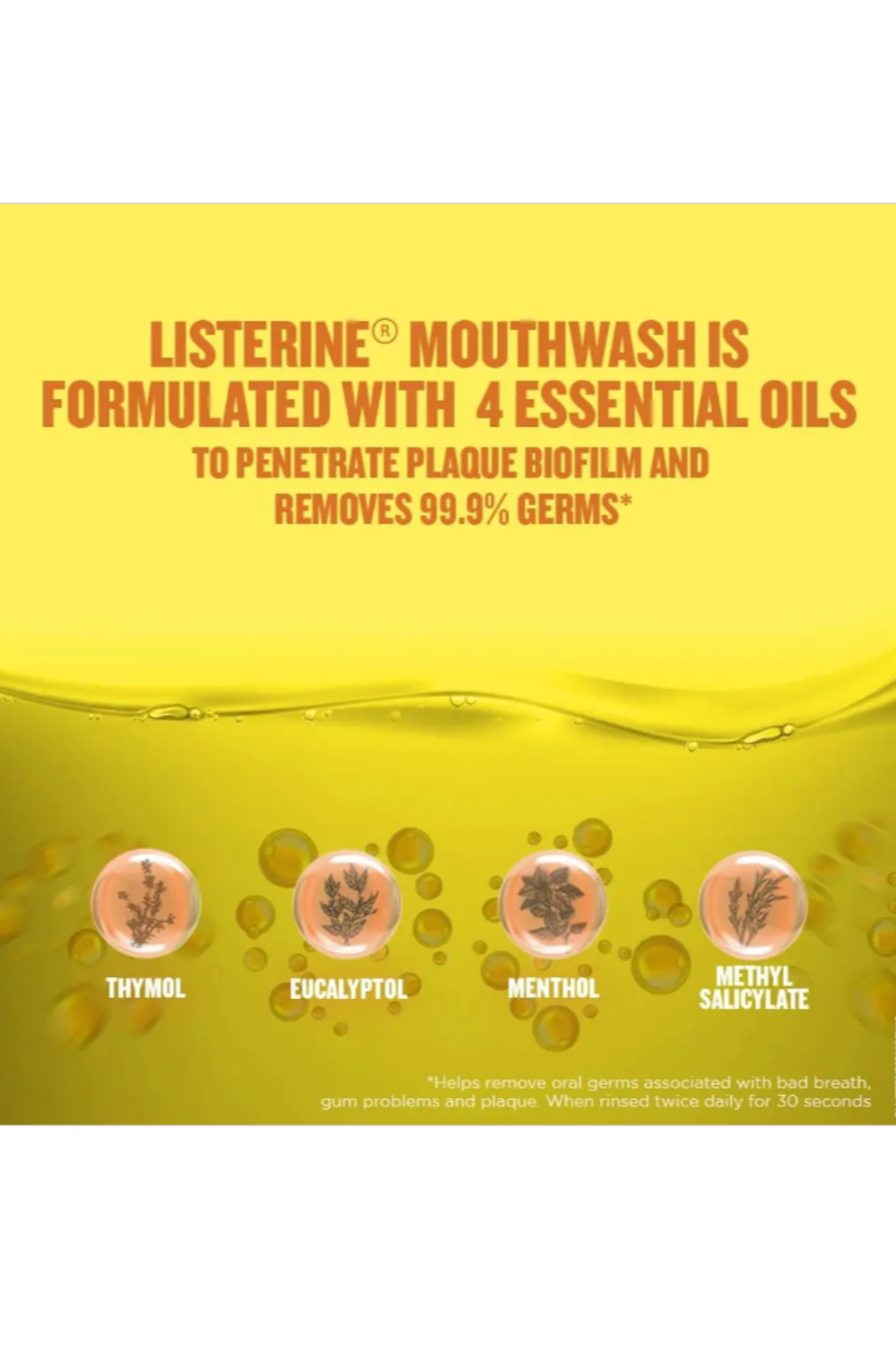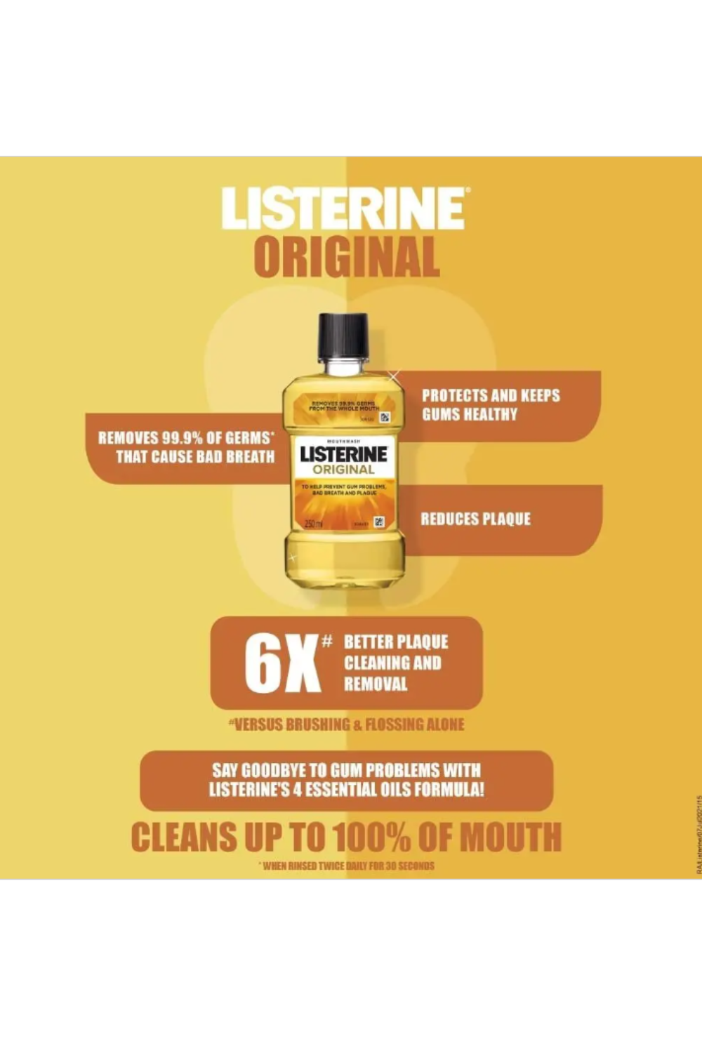LISTERINE® ORIGINAL Mouthwash provides up to twenty-four-hour protection against plaque, bad breath and gum problems. A thirty-second rinse with LISTERINE® ORIGINAL Mouthwash during your morning and night-time routines gives you up to twenty-four-hour protection against germs that cause plaque and gum problems. Our unique formula with four Essential Oils (Menthol, Thymol, Eucalyptol, Oil of Wintergreen) deeply penetrates to remove the bacteria in the plaque biofilm.