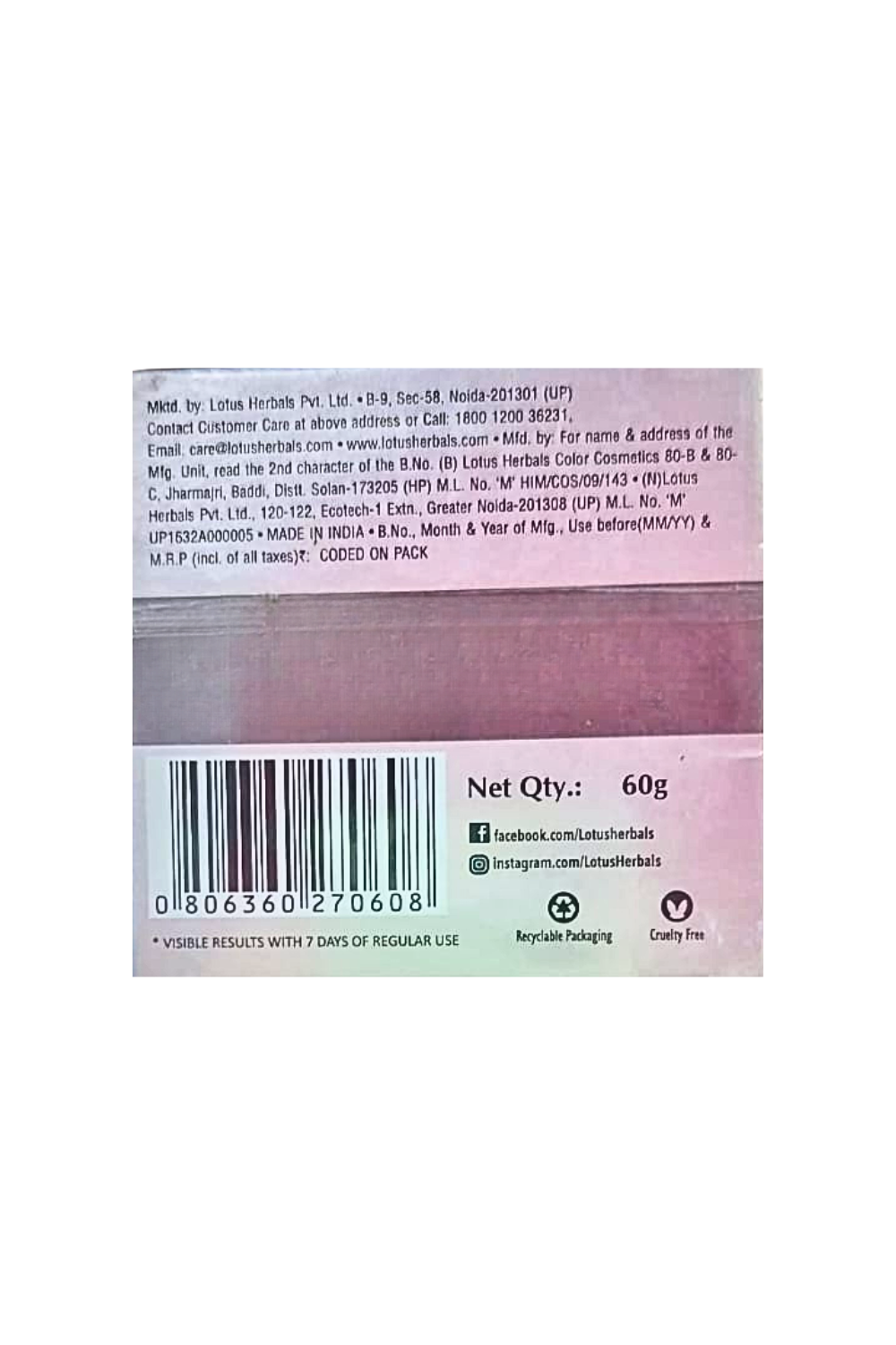 Marketed By: Lotus Herbals Pvt.Ltd., B-9, Sec-58, Noida-201301(UP)