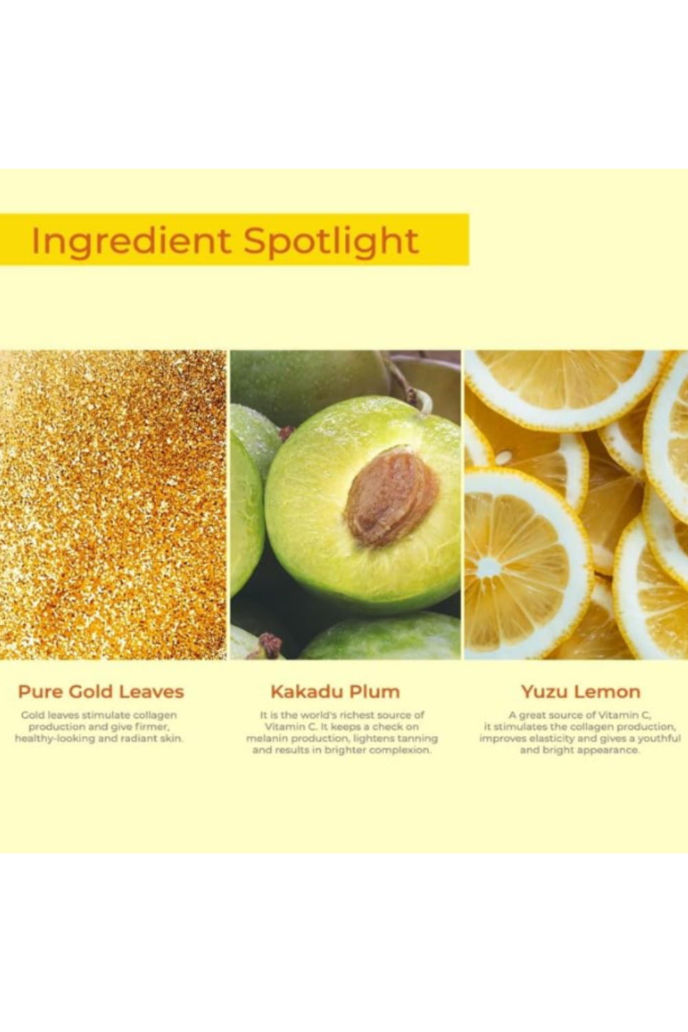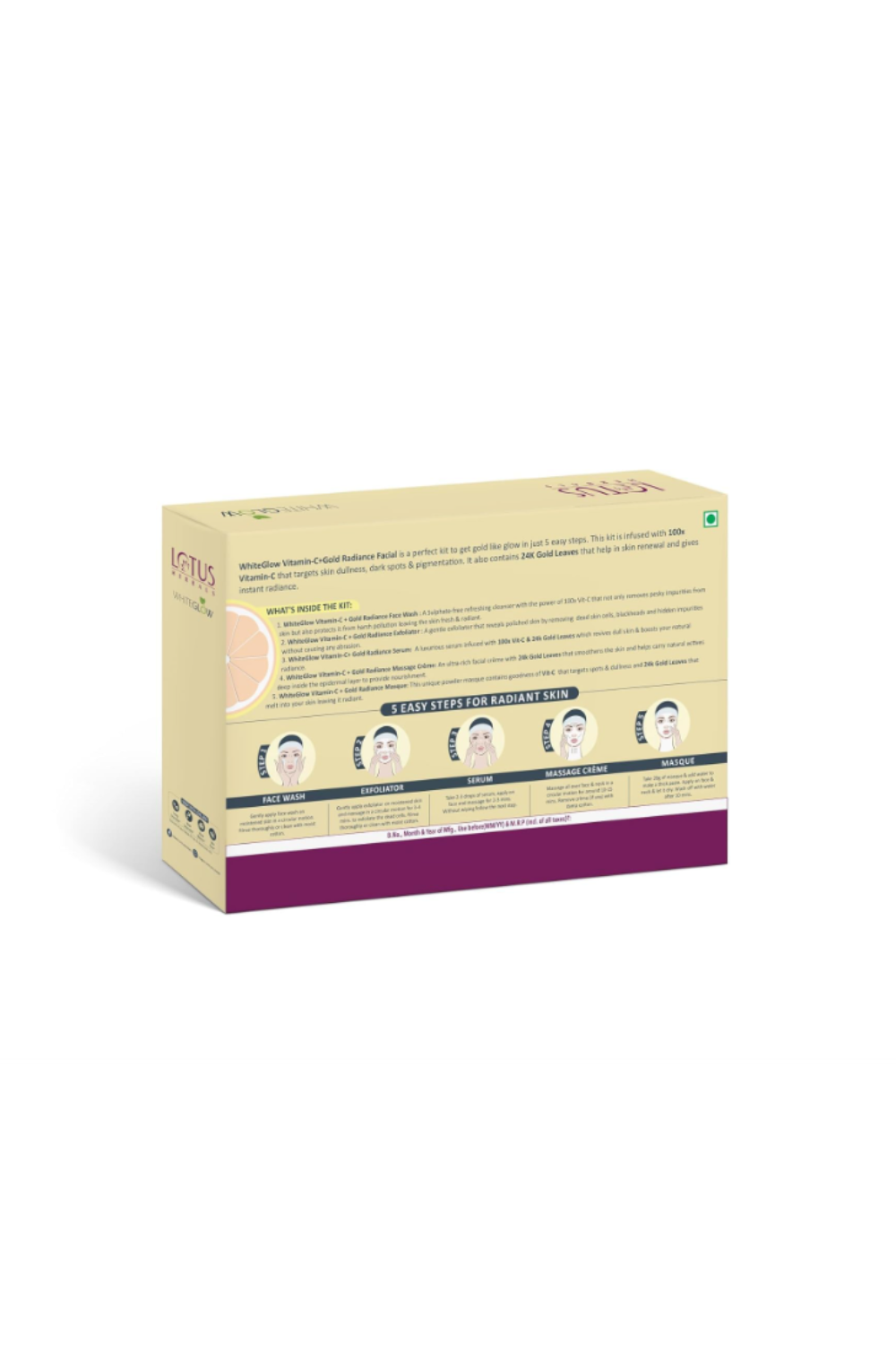 WhiteGlow Vitamin C + Gold Radiance Facial is your go-to solution for achieving luminous, spot-free and gold-like glow effortlessly in just 5 simple steps. Trusted by Salon Experts, this kit is infused with 100x more Vitamin C that targets dark spots, skin dullness and pigmentation. It also contains 24k gold leaves that help in skin renewal and gives instant radiance. Elevate your skincare ritual – embrace the power of 100x* more Vitamin C and make every skincare moment a golden one with WhiteGlow Vitamin C+Gold Facial Kit. ""WhiteGlow Vitamin C + Gold Radiance Facial is your go-to solution for achieving luminous, spot-free and gold-like glow effortlessly in just 5 simple steps. Trusted by Salon Experts, this kit is infused with 100x more Vitamin C that targets dark spots, skin dullness and pigmentation. It also contains 24k gold leaves that help in skin renewal and gives instant radiance. Elevate your skincare ritual – embrace the power of 100x* more Vitamin C and make every skincare moment a golden one with WhiteGlow Vitamin C+Gold Facial Kit. Enriched with Yuzu Lemon (a great source of Vitamin C, it stimulates collagen production, rejuvenates the skin for a more youthful appearance by improving elasticity), Kakadu Plum (known to be the richest source of Vitamin C, it keeps a check on tyrosinase that keeps a check on melanin production and also helps lighten tan thereby giving a glowing complexion) and 24k Gold Leaves (an ingredient celebrated for its rejuvenating properties, aiding in skin renewal and providing and instant boost of radiance. It has the ability to promote youthful looking skin by stimulating collagen and increasing skin elasticity for a firmer complexion).