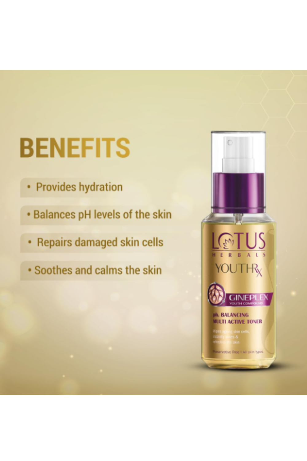 The Lotus Herbals YouthRx pH Balancing Multi Active Toner is a testament to a revolutionary development in ‘Green Science’. It comes with the ‘Gineplex Youth Compound’ derived from potent natural ingredients and is clinically proven to accelerate the process of skin lifting, firming and protective skin action.