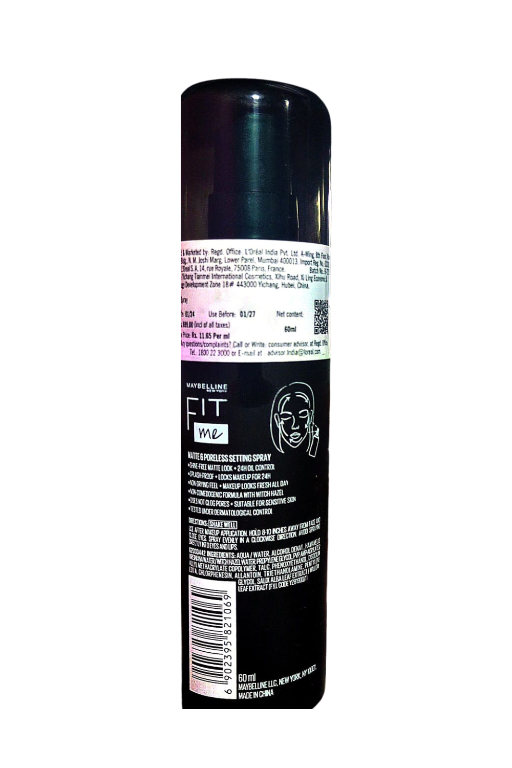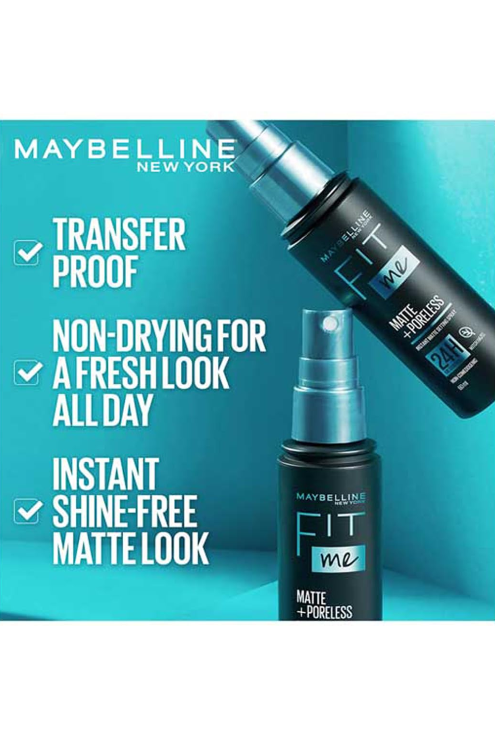 • The Maybelline Matte + Poreless Fit Me Setting Spray is enriched with Witch Hazel and Clay that soothes and protects your skin while giving it a mattifying finish.