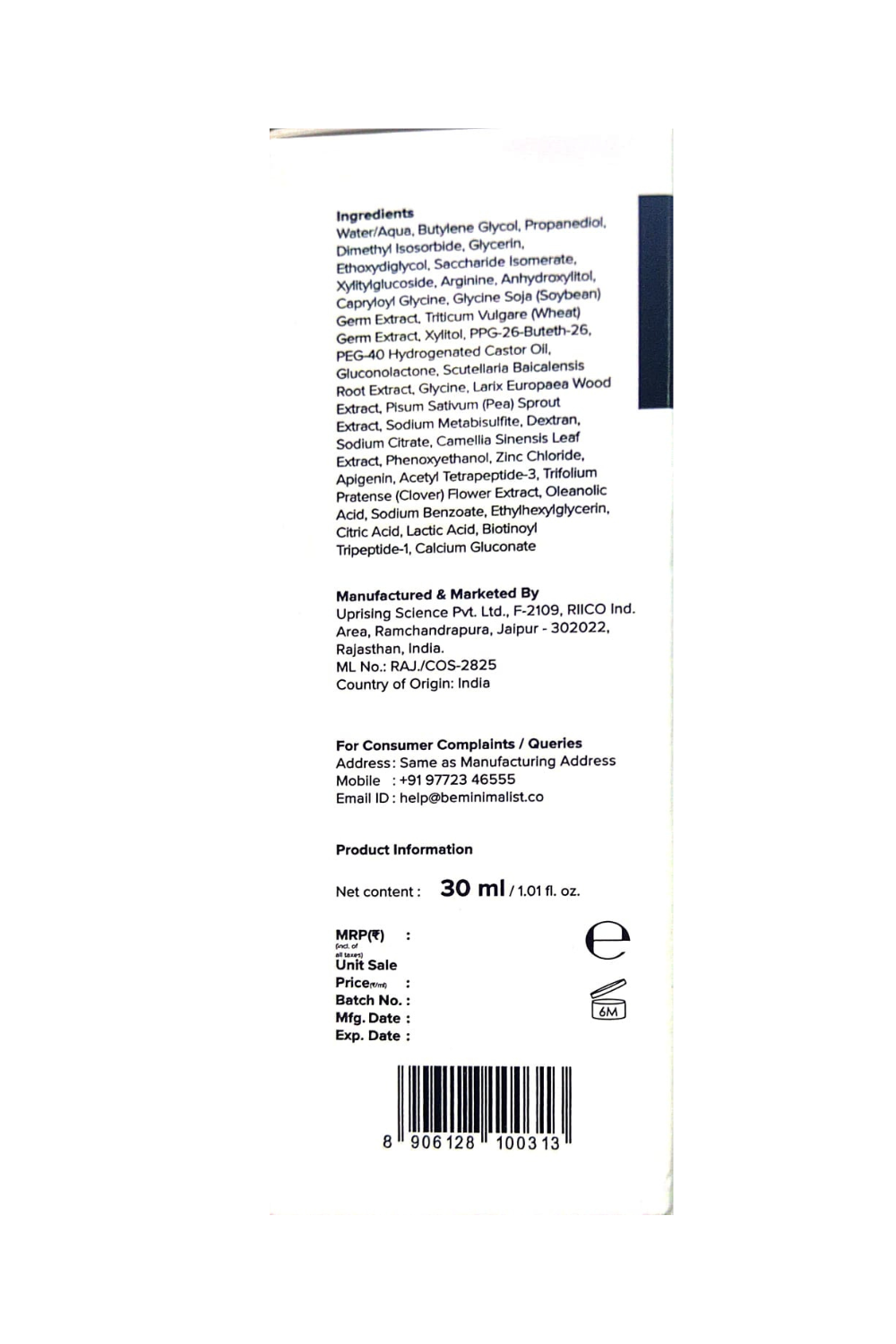 Butylene Glycol, Aqua, Dextran, Acetyl Tetrapeptide-3, Trifolium Pratense (Clover) Flower Extract, Propanediol, Arginine, Glycine Soja (Soybean) Germ Extract, Triticum Vulgare (Wheat) Germ Extract, Scutellaria Baicalensis Root Extract, Sodium Benzoate, Gluconolactone, Calcium Gluconate, Glycerin, Ppg-26-Buteth-26, Peg-40 Hydrogenated Castor Oil, Apigenin, Oleanolic Acid, Biotinoyl Tripeptide-1, Pisum Sativum (Pea) Sprout Extract, Isomalt, Sodium Metabisulfite, Larix Europaea Wood Extract, Glycine, Zinc Chloride, Camellia Sinensis Leaf Extract, Xylitylglucoside, Anhydroxylitol, Xylitol, Saccharide Isomerate, Sanguisorba Officinalis Root Extract, Serenoa Serrulata (Saw Palmetto) Fruit Extract, Capryloyl Glycine, Phenoxyethanol, Ethylhexylglycerin, Citric Acid, Sodium Citrate, Lactic Acid