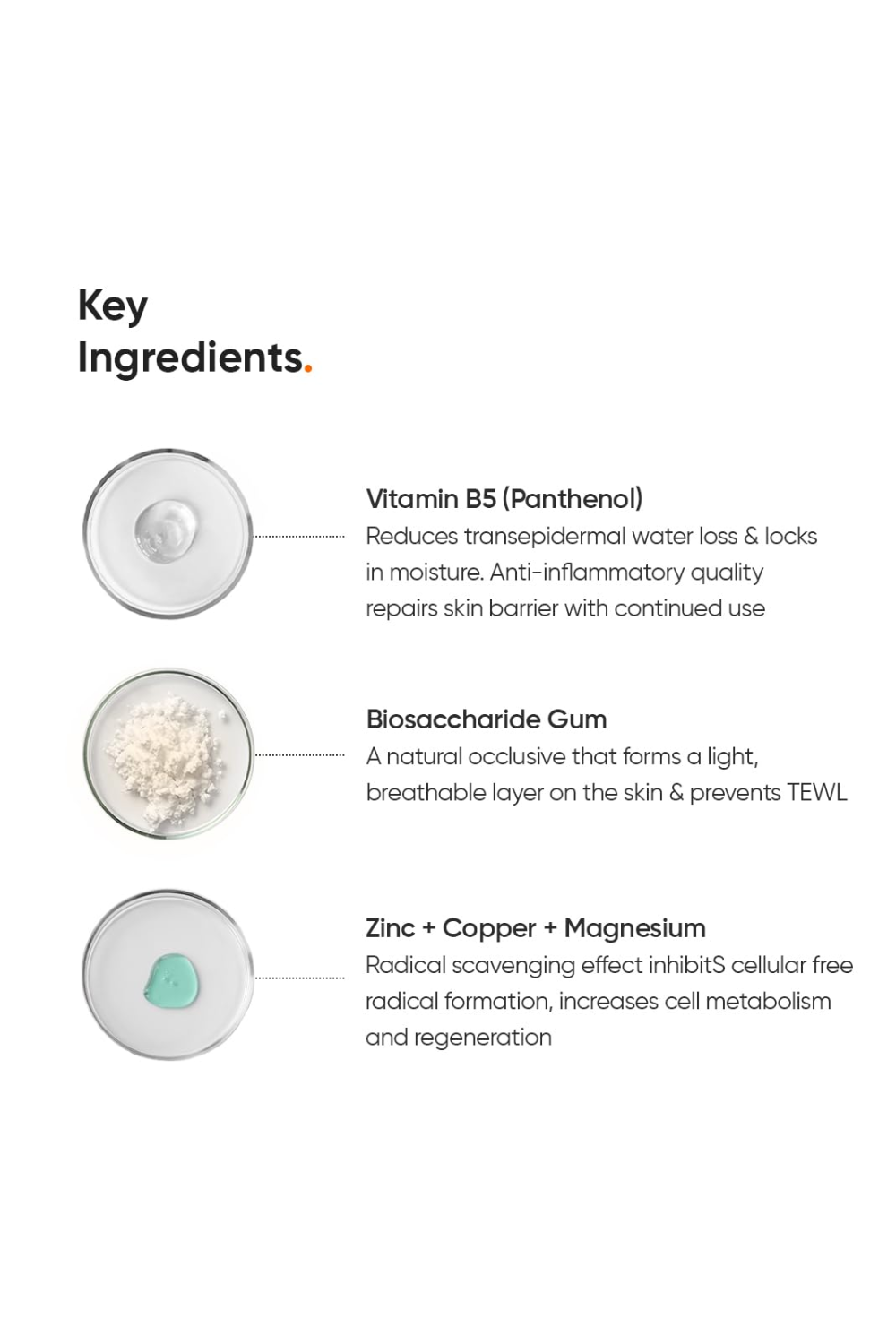 Vitamin B5 (Panthenol) Provides Deep Penetrating Moisture To The Skin, Stimulates Epithelization To Provides Wound Healing And Anti-Inflammatory Effects. This Makes Vitamin B5 An Excellent Ingredient As It Shows Immediate Effects As Humectants And Reduces Tewl With Continued Use By Repairing Skin Barrier Biosaccharide Gum A Natural Occlusive That Forms A Light, Breathable Layer On The Skin And Prevents Tewl Zinc, Copper & Magnesium Have Radical Scavenging Effect And Together They Inhibit The Cellular Free Radical Formation. These Minerals Also Boost Oxygenation Of The Skin Cells And Result In Increased Cell Metabolism And Cell Regeneration Aqua, Panthenol, Cyclopentasiloxane, Dimethicone Crosspolymer, Xylitylglucoside, Anhydroxylitol, Xylitol, Peg/Ppg-18/18 Dimethicone, Magnesium Aspartate, Zinc Gluconate, Copper Gluconate, Betaine, Phenoxyethanol, Allantoin, Pentylene Glycol, Ethylhexylglycerin, Carbomer, Magnesium Sulfate Heptahydrate, Hydroxyethyl Acrylate/Sodium Acryloyldimethyl Taurate Copolymer