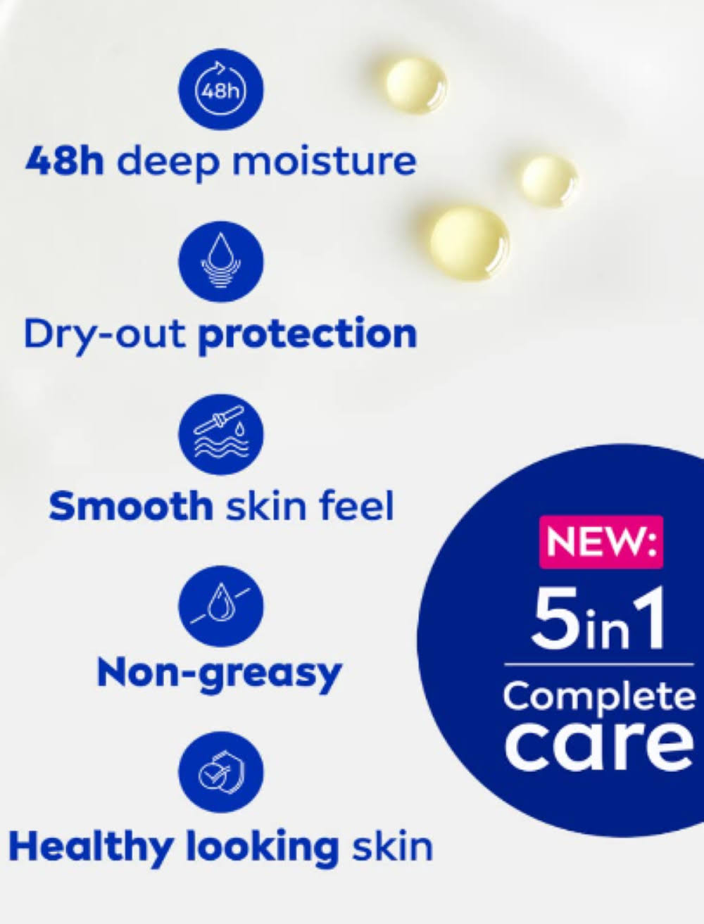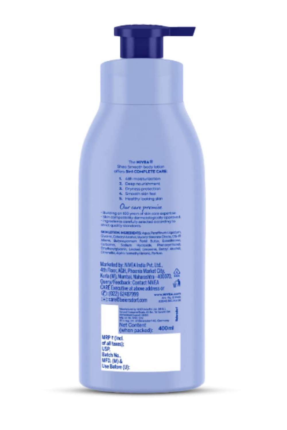 Indulge in deep moisture care with the new NIVEA Shea Smooth Body Lotion. Enriched with shea butter and deep moisture serum, it deeply moisturizes dry skin and gives it a silky smooth feeling that lasts for up to 48 hours.
