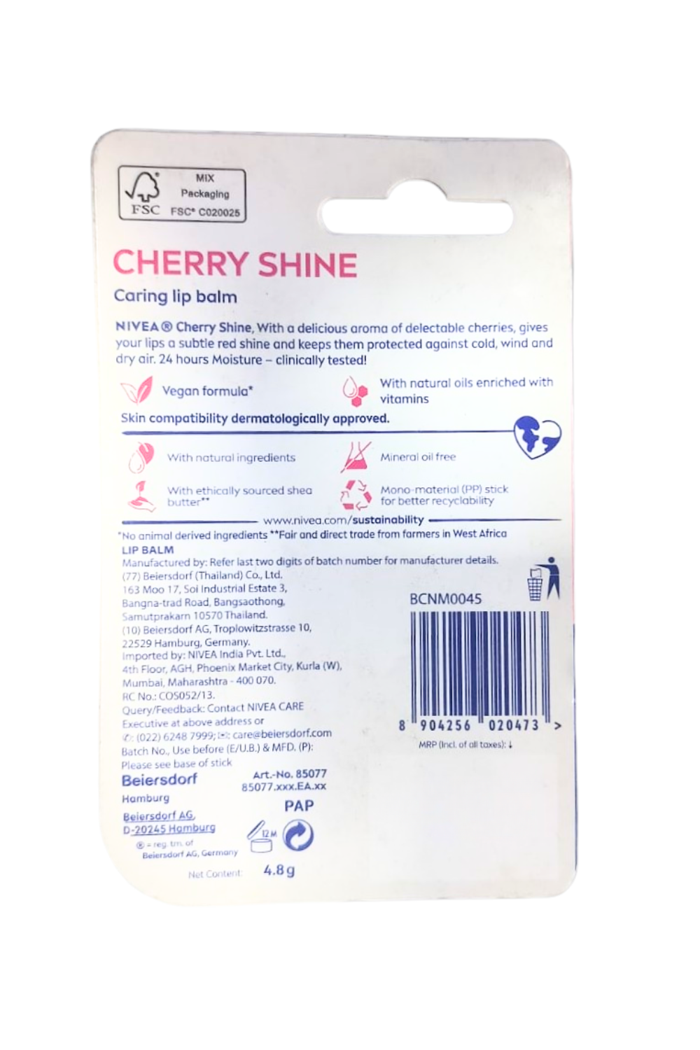 CARE EFFECT: So do you want long lasting moisture and a touch of delicate colour for your lips with fabulous shimmer? Now experience, long lasting moisturization combined with delightful cherry aroma and chosen pigments that leave a touch of colour on your lips with NIVEA Cherry Shine. Your lips care a lot for you, now it’s your turn to care for them.