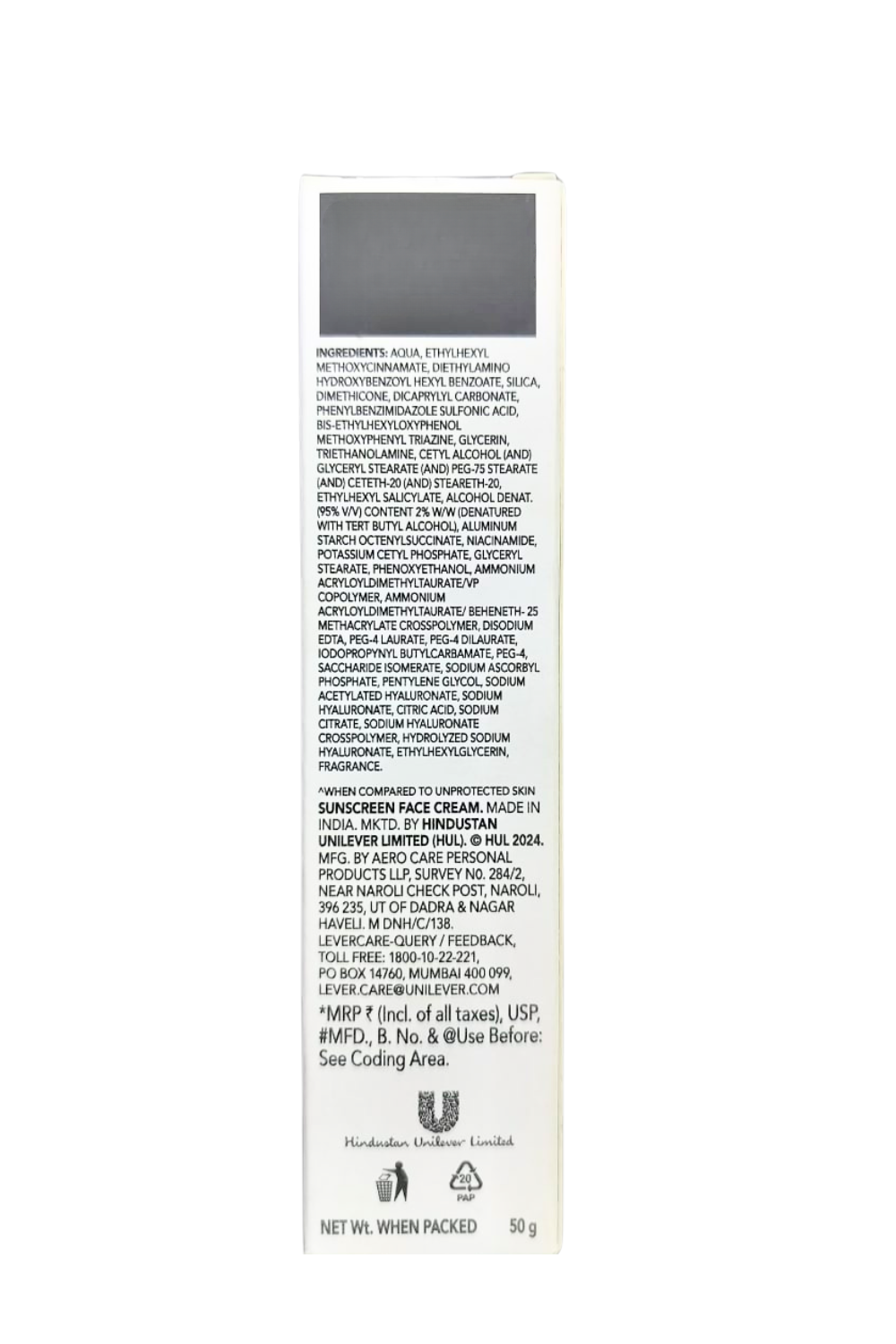 Marketed By: Sunscreen face cream Made in India Marketed by Hindustan Unliver Limited (HUL)