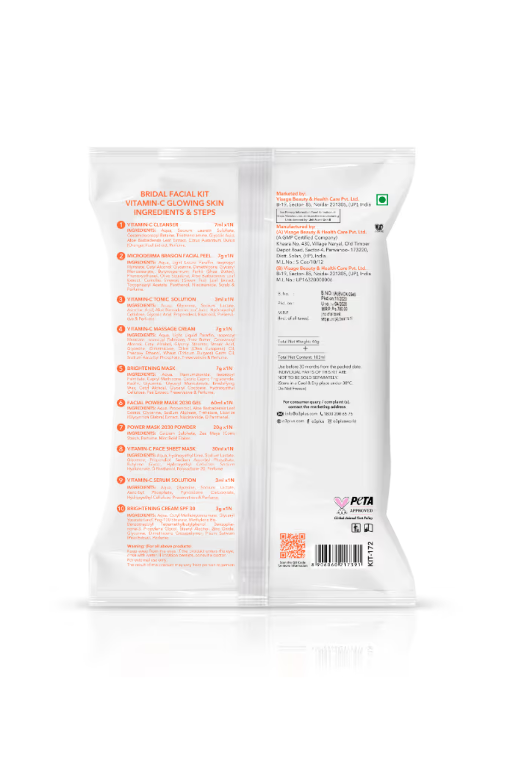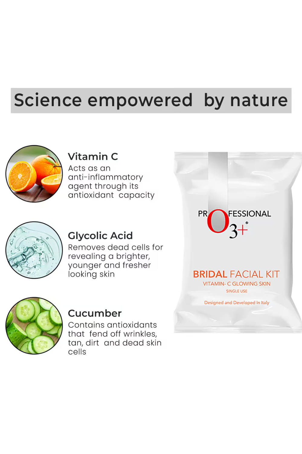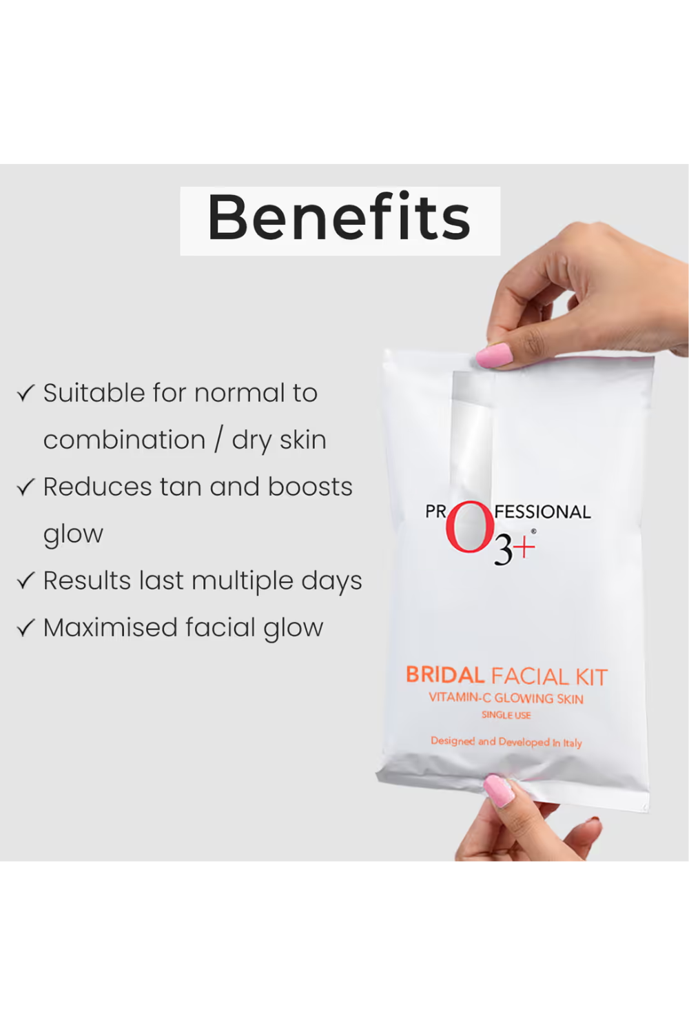 - Complete bridal care solution: O3+ Bridal Facial Kit Vitamin C Glowing Skin is a 10-step regimen that ensures wonderful results as it boosts radiance while solving multiple skin concerns. All containments of this kit work together to brighten, moisturize, purify and remove tan from the skin.