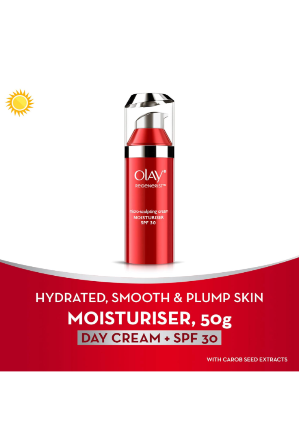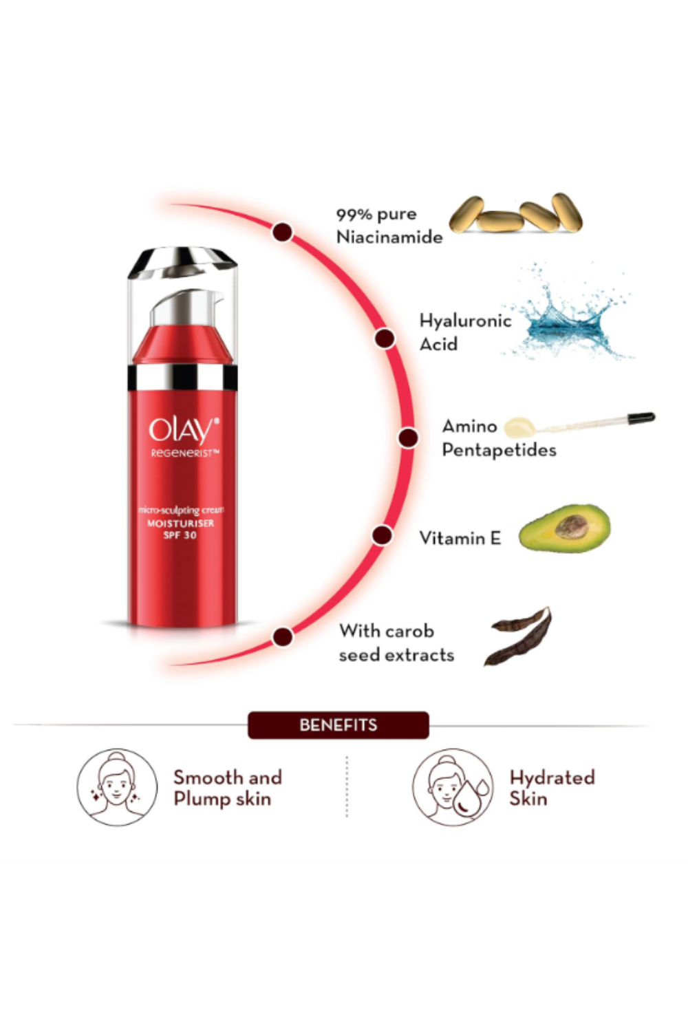 Olay regenerist advanced anti-ageing microsculpting cream moisturizer SPF 30 combines proven anti ageing technology and SPF protection with a revolutionary and surprisingly lightweight feel. Its proven regenerist technology works to reenergise skin-surface cells for a more youthful look, helping firm skin that has lost elasticity from skin damage.