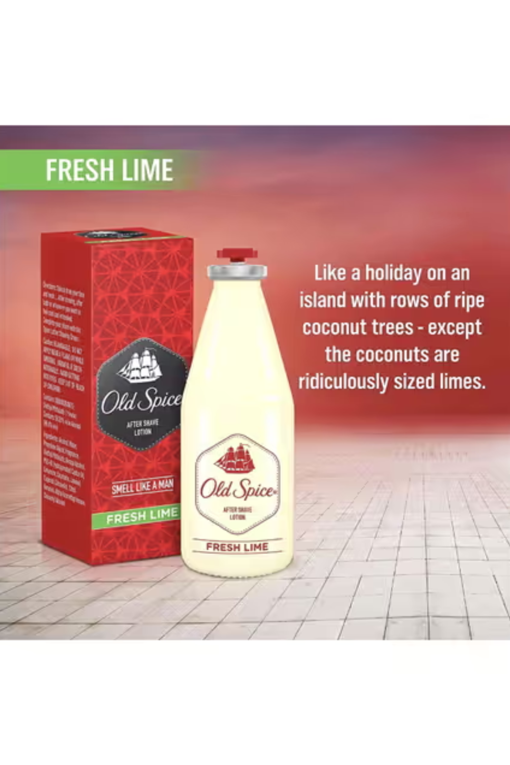 NourishingSmootheningGet the most out of your shave with the Old Spice Fresh Lime After Shave Lotion (150ml). This soothing after-shave lotion is a refreshing after-shave specifically designed to calm and heal the skin post-shaving. Also, this Old Spice after-shave lotion helps you regain all the freshness and moisturizer lost during the process. Plus, it quickly helps reduce any irritation from razor cuts or nicks.