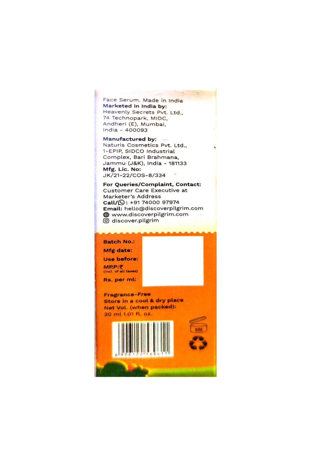 Manfactured By: Naturis Cosmetics Pyt Ltd., 1-EPIP, SIDCO Industrial Complex. Bari