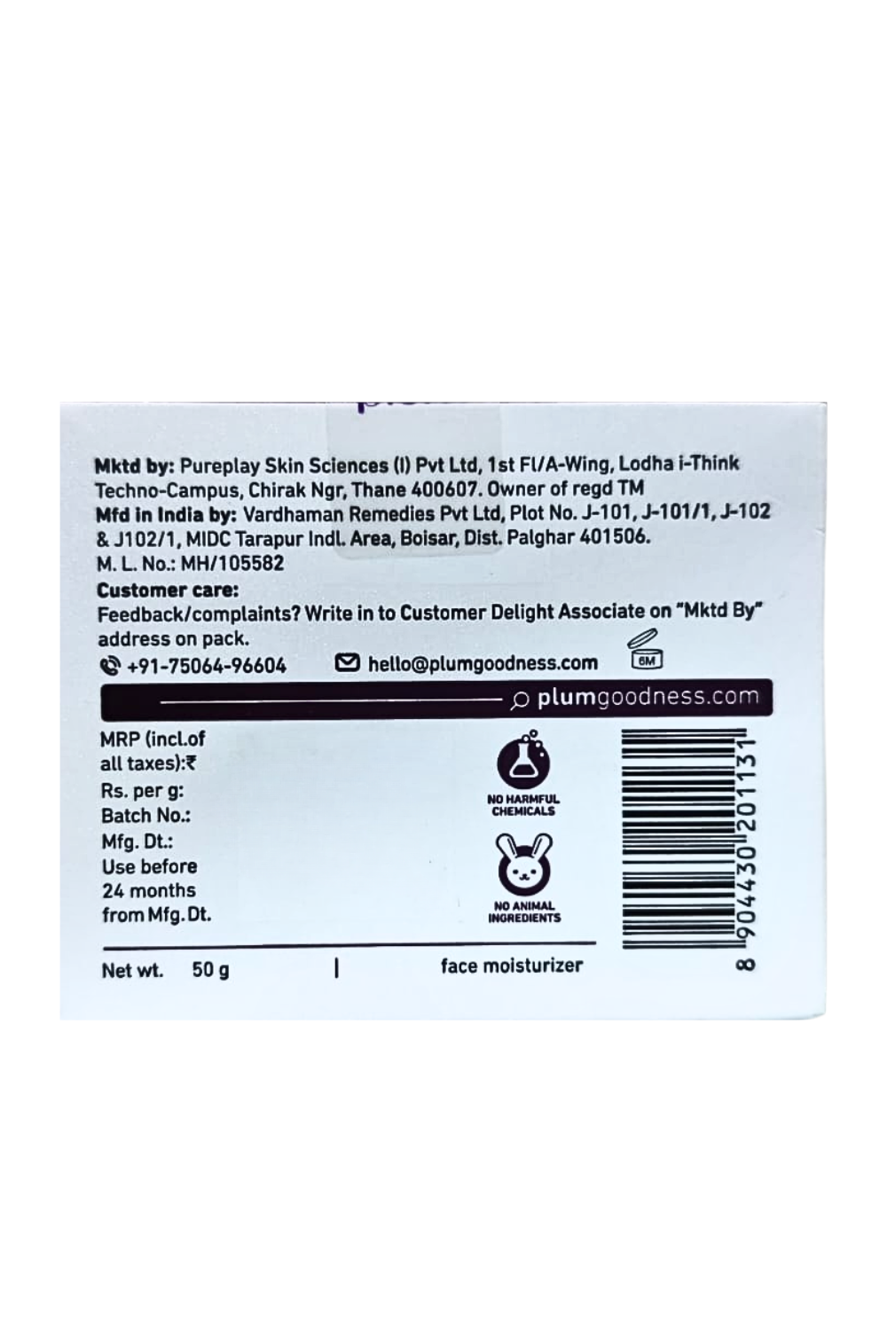 Marketed By: Pureplay Skin Sciences (I) Pvt. Ltd., 1st Fl/A-Wing, Lodha i-Think Techno Campus, Chirak Ngr, Thane 400607, Owner of regd TM